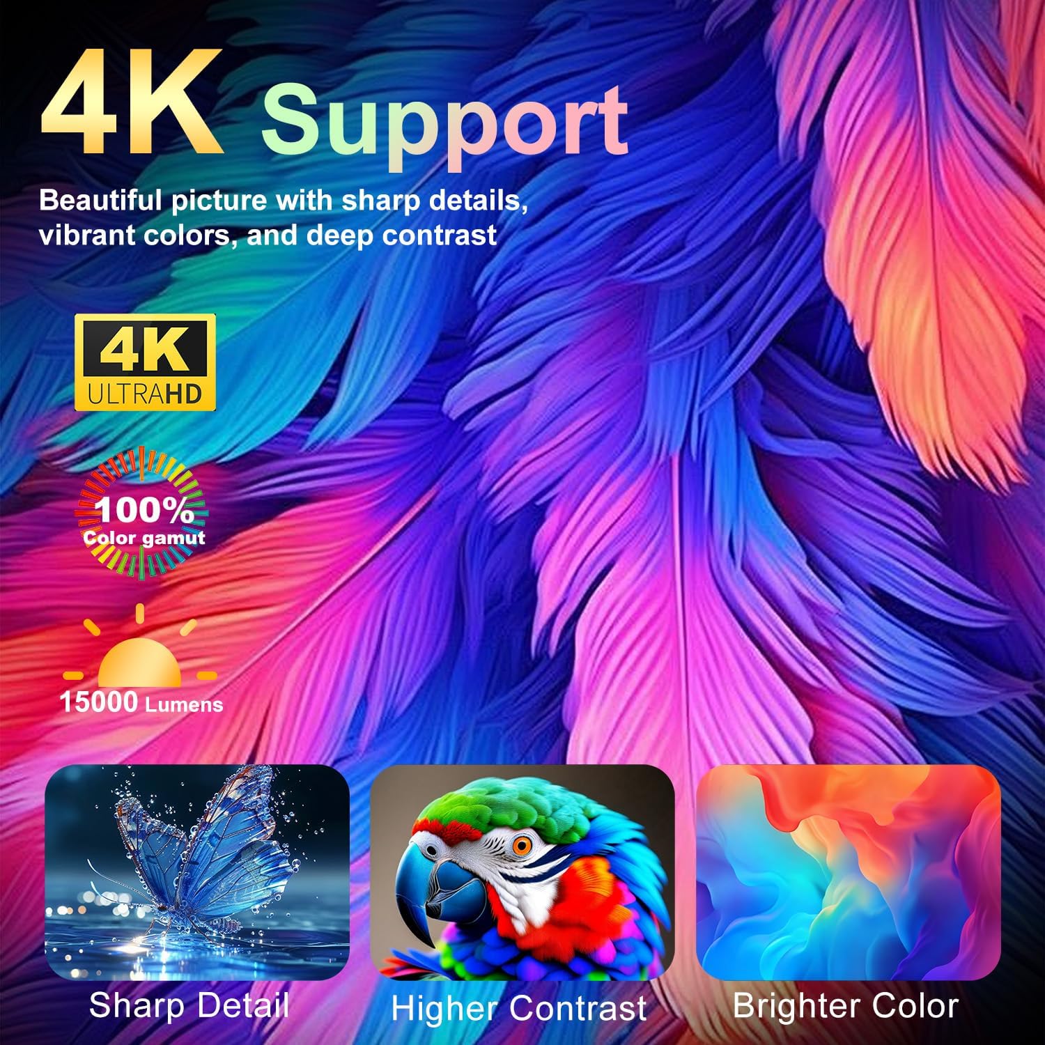 【Outstanding image quality】 Supports native resolutions of 4K and full HD 1080P, fully parsing 4K dynamic 60 frames per second of H.264, 8k dynamic 24 frames per second and a brightness of up to 700 ANSI lumens, providing clear and vivid images, enhancing your viewing, gaming and presentation experiences, whether during the day or night, at home, outdoors or in business meetings. All can enjoy perfect visual effects. This 4K projector features a brightness of 750 ANSI lumens and an astonishing contrast ratio of 20,000:1, The 95% color coverage rate makes every frame more detailed and colorful, allowing your home theater and outdoor movie nights to experience as if you were in a cinema!