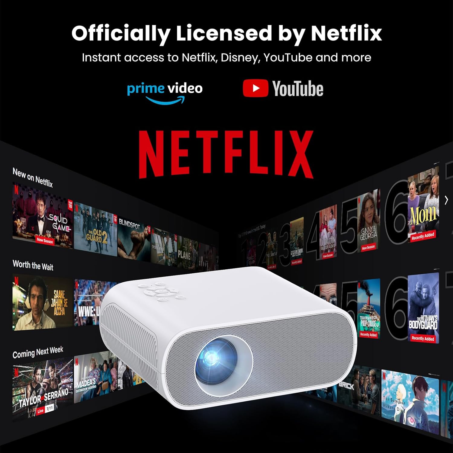 Official Licensed Netflix: Transform any room into a cinematic experience with our advanced 4K supported Netflix projector. It provides instant streaming access to Netflix, Prime Video, YouTube, and thousands of other titles. Enjoy the convenience of watching your favorite shows and movies without the need for an additional TV stick