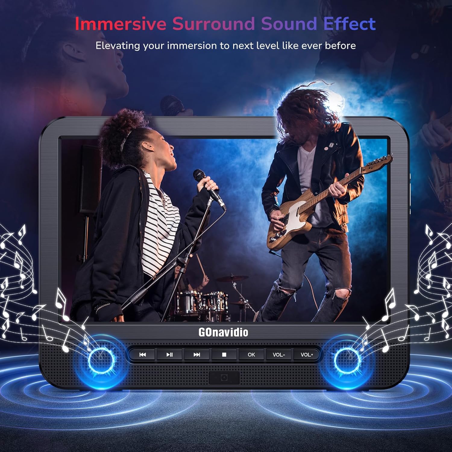 Front Clamshell Design & Dual Speakers: Front clamshell design makes it easier and safer for children to change discs without removing the car headrest DVD player. Besides, the dual screen Blu Ray DVD players, specially designed with upgraded dual front stereo speakers, provide clearer stereo sound and also can avoid sound disturb to the front passengers