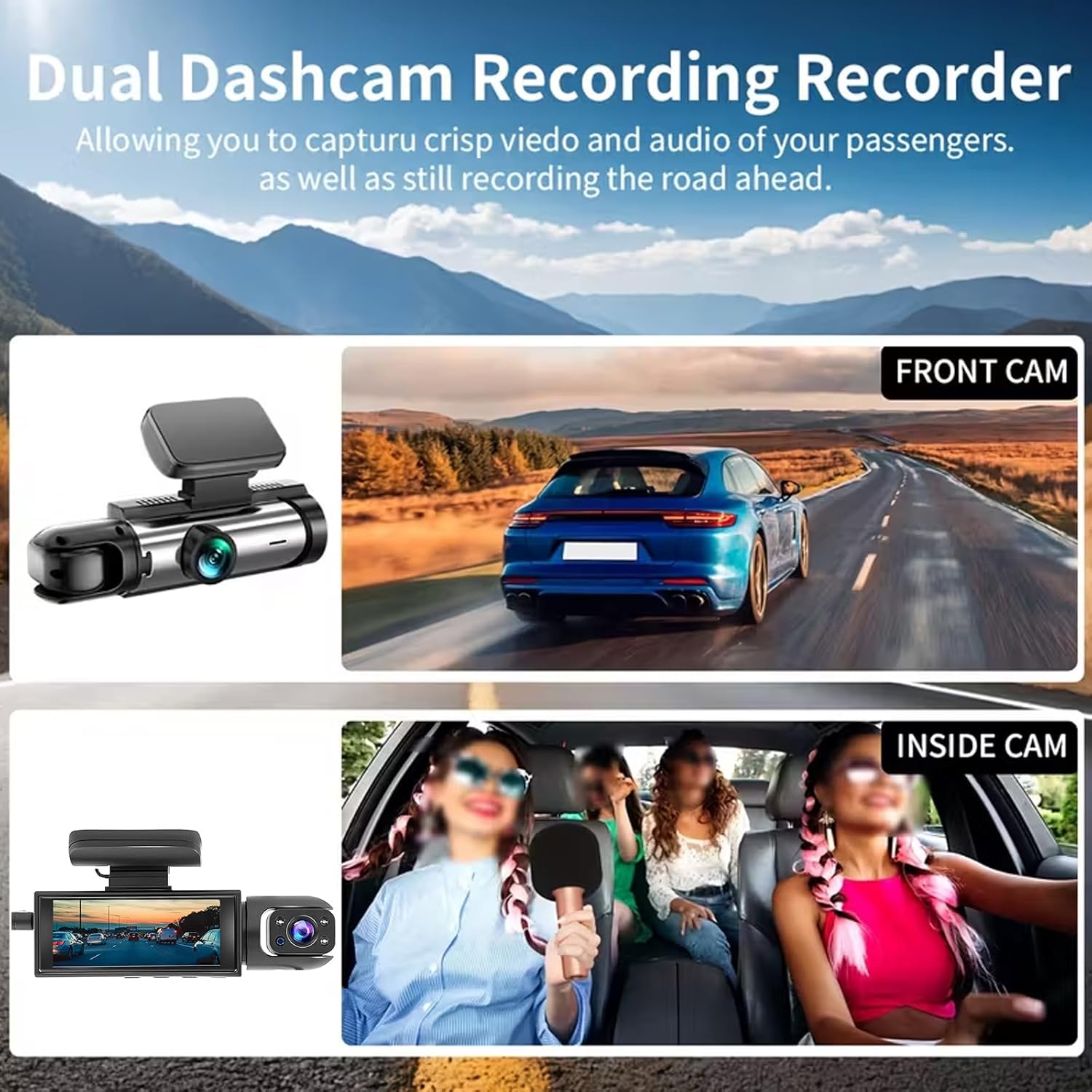 Features: 3.16 Inch IPS 1080P HD monitor with dual dash camera HD Front camera with super night vision and 150wide angle Cabin inside camera with 3 IR Light to capture the driver and passengers Dual channel for front/interior view, support split screen to view at the same time Support loop recording, auto cover previous video 32GB TF card and saving evidence to protect your right 24h parking monitoring and gravity sensor functions Easy installation, just plug and play Wide compatibility, such as cars, trucks, RVs, trailers, motorcycle, Jeeps, vans, SUVs, etc. Specifications: Working Power (DCV): 12V USB interface: Mini USB Video format: MOV Picture format: JPEG S/N ratio: Better Than 48db Waterproof Class: IP 66 Lens Angle: 150 Power interface: DC 5V/1.5A Support TF card: 64G (maximum) Package Included: 1 x Dash Camera 1 x 32GB TF Card 1 x Car charger 1 x User Manual Note: Built-in 150mAh battery is just for emergency recording and save settings. Please keep the dashcam plugged in always, the dual dash cam will shut down after 5 seconds when there is no external power connection. Do not leave the cars camera in direct sunlight for a long period of time or where the temperature could go above 170F (75C). Brings you clear video, recording your wonderful trips and ensuring your driving safe and joyful