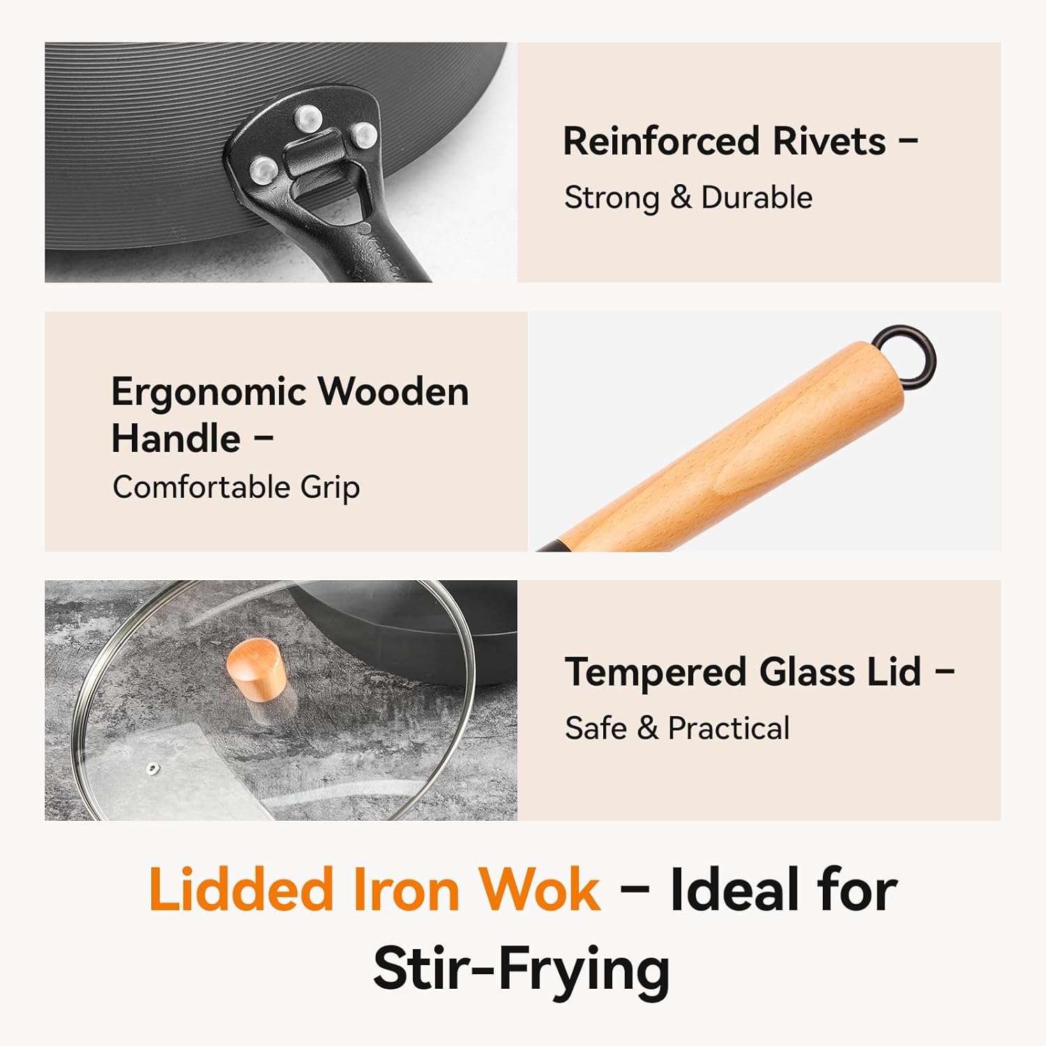 【Ergonomic Wooden Handle & Lid Included】The extended wooden handle stays cool to the touch, providing comfort and safety during high-heat cooking. The matching wooden lid helps trap heat, moisture, and flavor, making the wok versatile for stir-frying, steaming, braising, or shallow frying. A complete stir fry pan set that brings convenience and tradition together