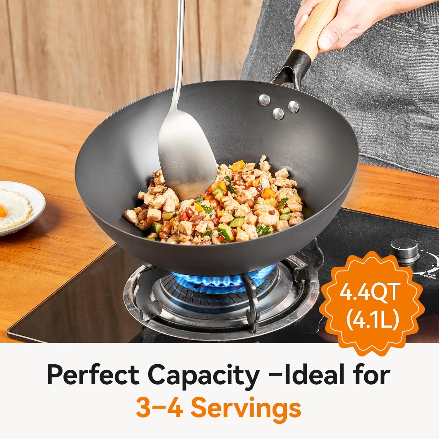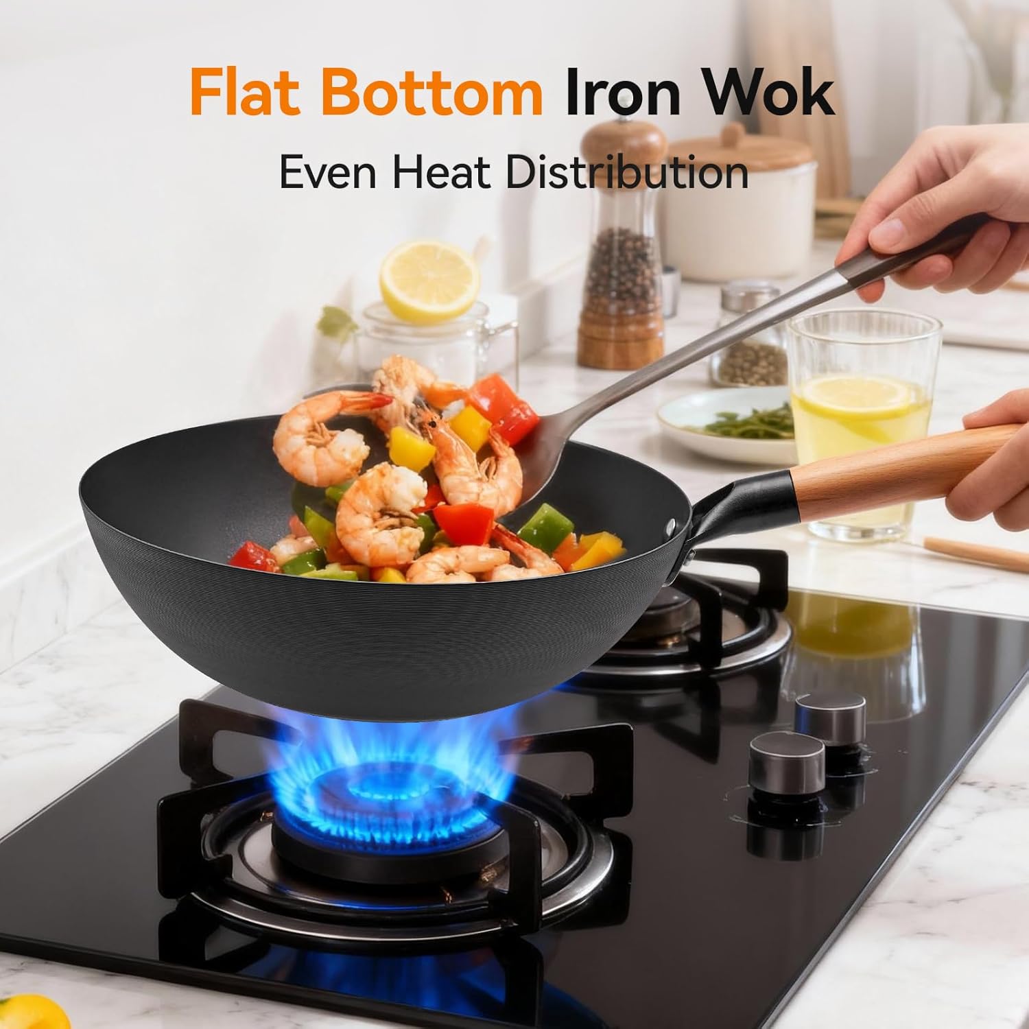 【Flat Bottom Design – Induction Compatible】Designed with a stable flat bottom, this induction wok sits securely on all types of cooktops, including gas, electric, ceramic, and induction stoves. It ensures even heat distribution and excellent wok stability, making it easy to cook with confidence in any modern kitchen