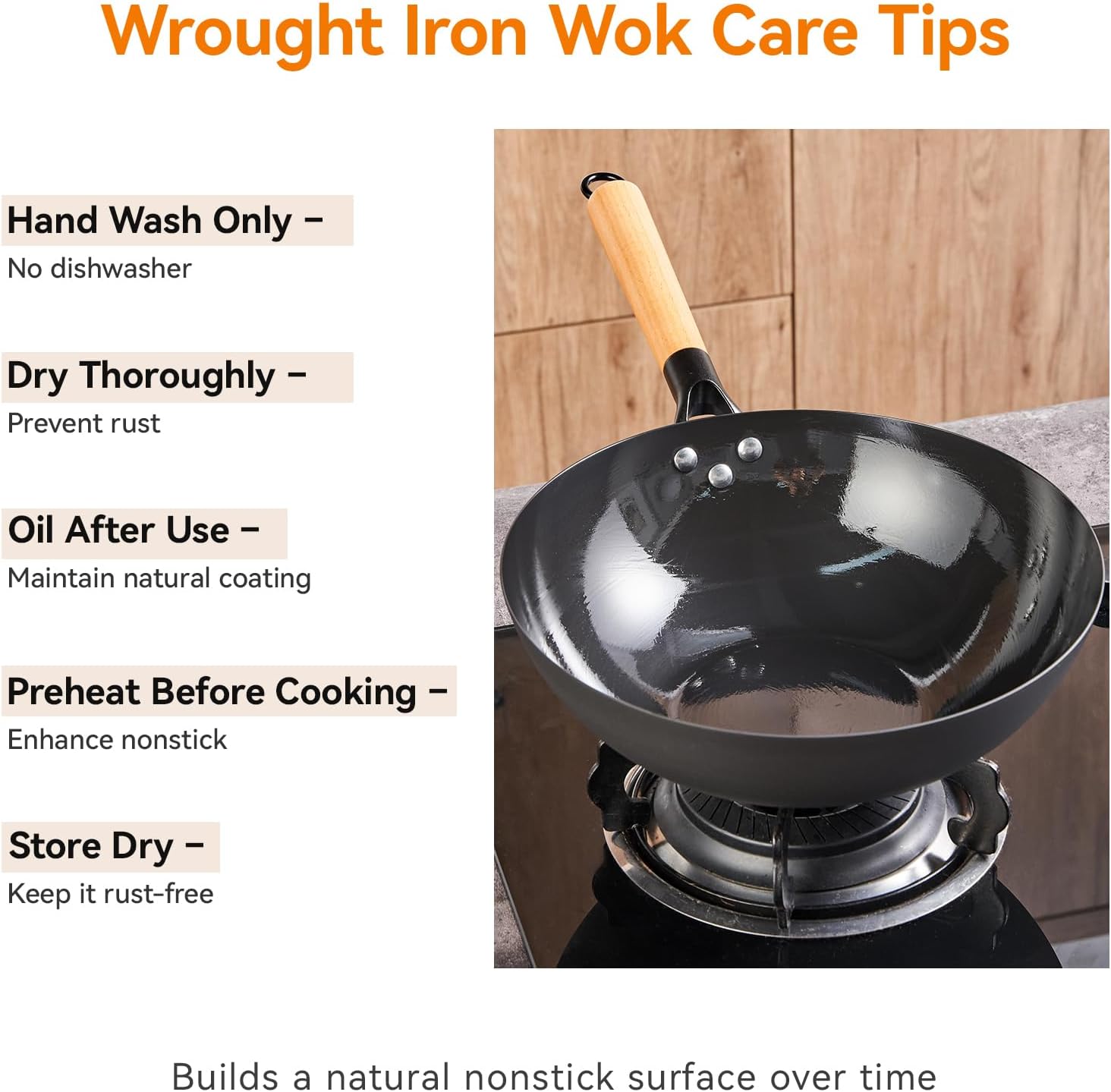 【Naturally Nonstick & Chemical-Free】Completely PTFE & PFOA-free, this iron wok contains no harmful coatings. Over time, it develops a natural nonstick patina that locks in flavor and preserves the authentic taste of ingredients. A safe, healthy, and eco-friendly choice for those who want a true nonstick wok without chemicals