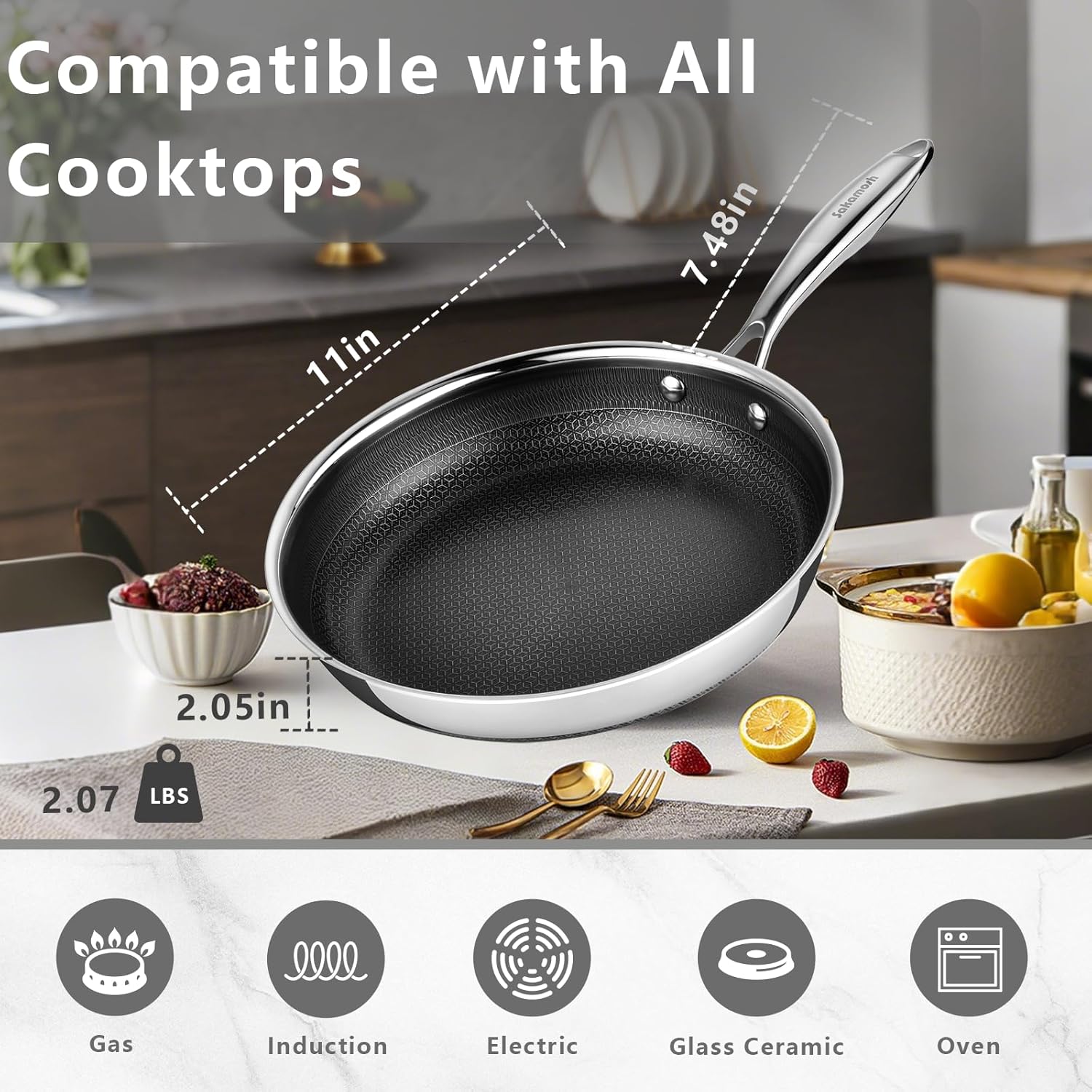 Tri-Ply Construction for Superior Heat Control: With a stainless steel-aluminum-stainless steel layered base, this pan ensures fast, even heating and excellent food release. The ergonomic hollow handle stays cool on the stovetop and provides a secure grip while cooking.