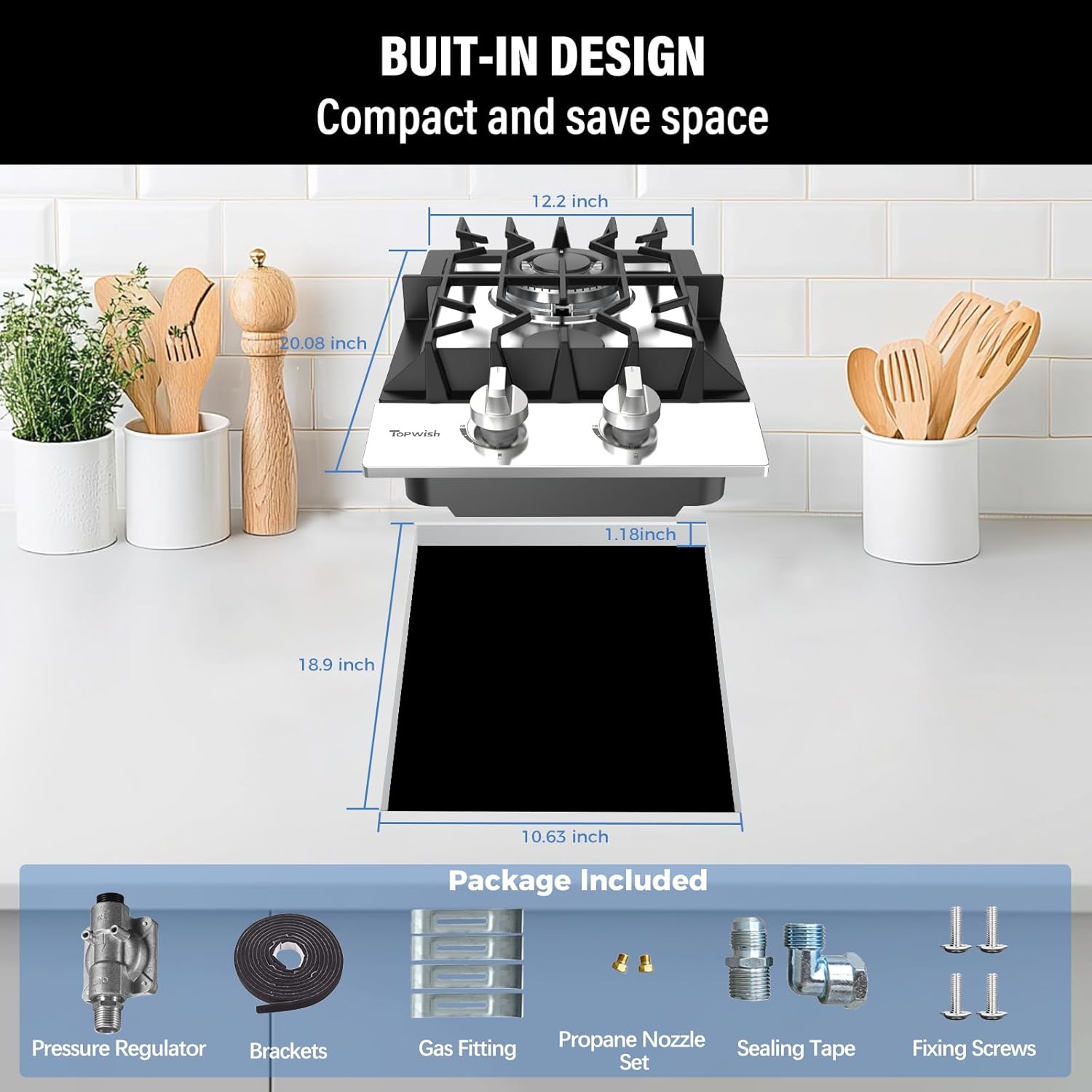 【Compact Performance】Measuring 12.2″ W x 20.08″ L x 1.18″ H with a cut-out size of 10.63″ W x 18.9″ L, The TOPWISH 2 Burner Propane Stove is ideal for RVs, apartments, or outdoor kitchens. Compact yet efficient, The TOPWISH Propane Stovetop fits seamlessly into various spaces. Includes professional customer service support for smooth installation and operation. Ensure the product dimensions meet your space requirements before purchase.