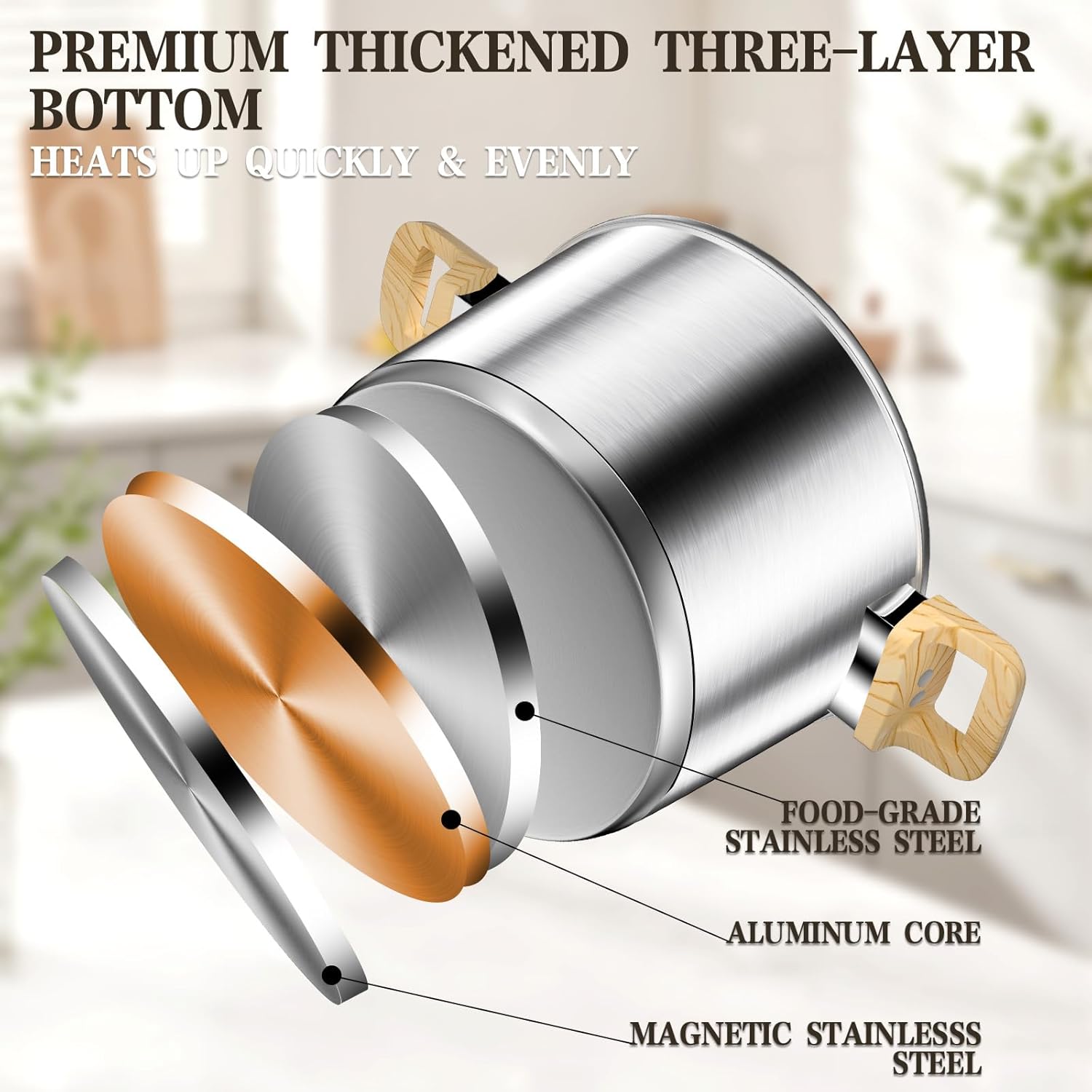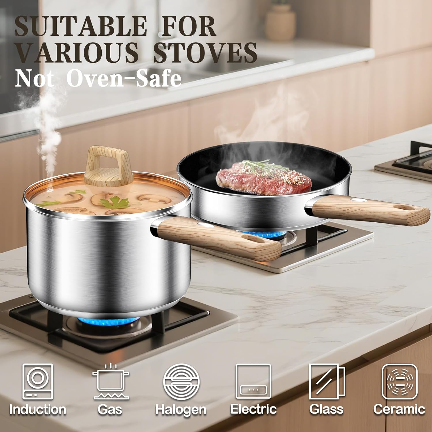[Even Heating & Multi-Hob Compatibility] The triple-layer thick base with aluminum core delivers fast preheating. Eliminates hot spots while saving energy. Perfect for searing, simmering, boiling, and sautéing. Suitable for various stovetop types including induction, gas, electric, and ceramic. Note: Due to the wooden handles, this cookware set is not suitable for oven use.