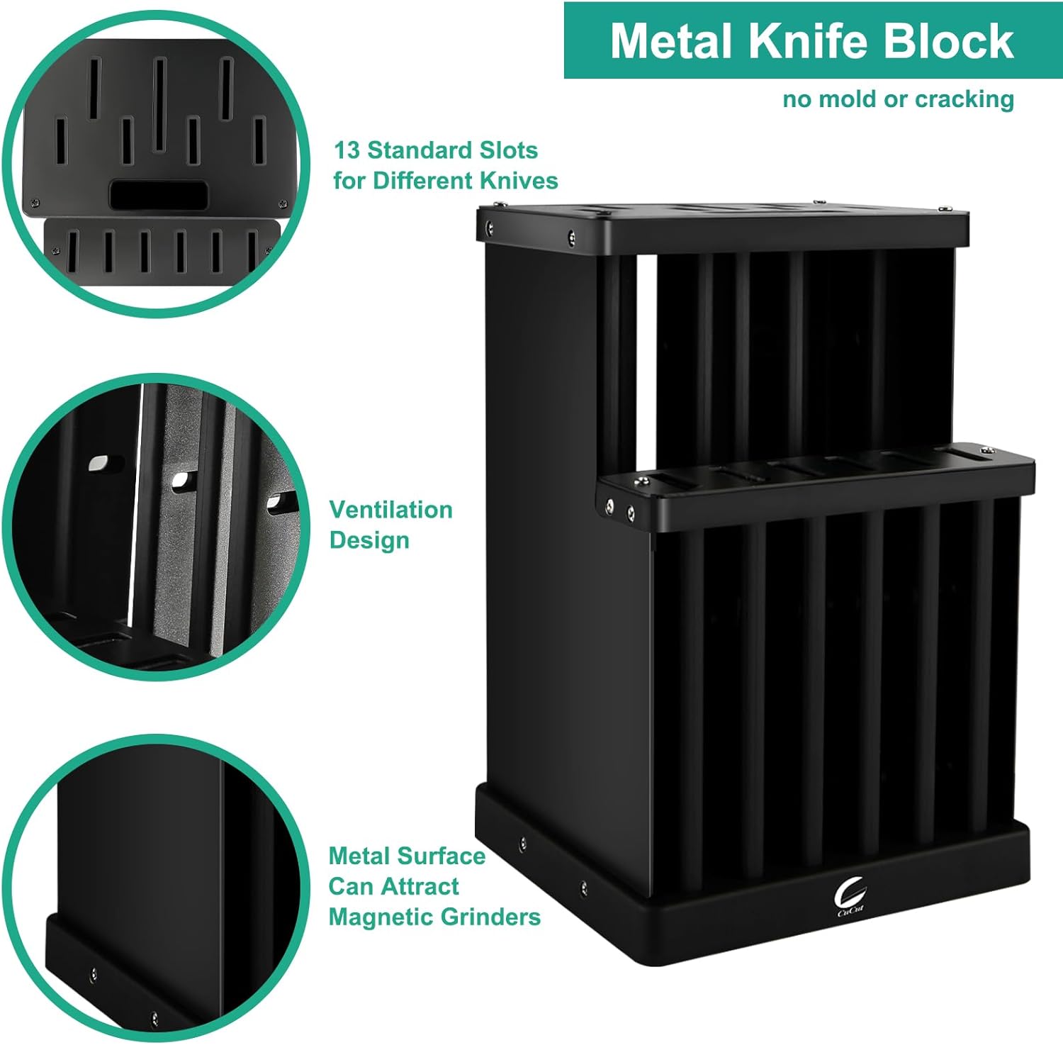 【All-in-One Premium Set】13 professional kitchen knives (Chef, Slicing, Bread, Utility, Paring, Boning + 6 Steak Knives), kitchen scissors, 2-stage sharpener & elegant metal block. Perfect knife set for kitchen – ideal cooking knife set for home chefs & newlyweds.