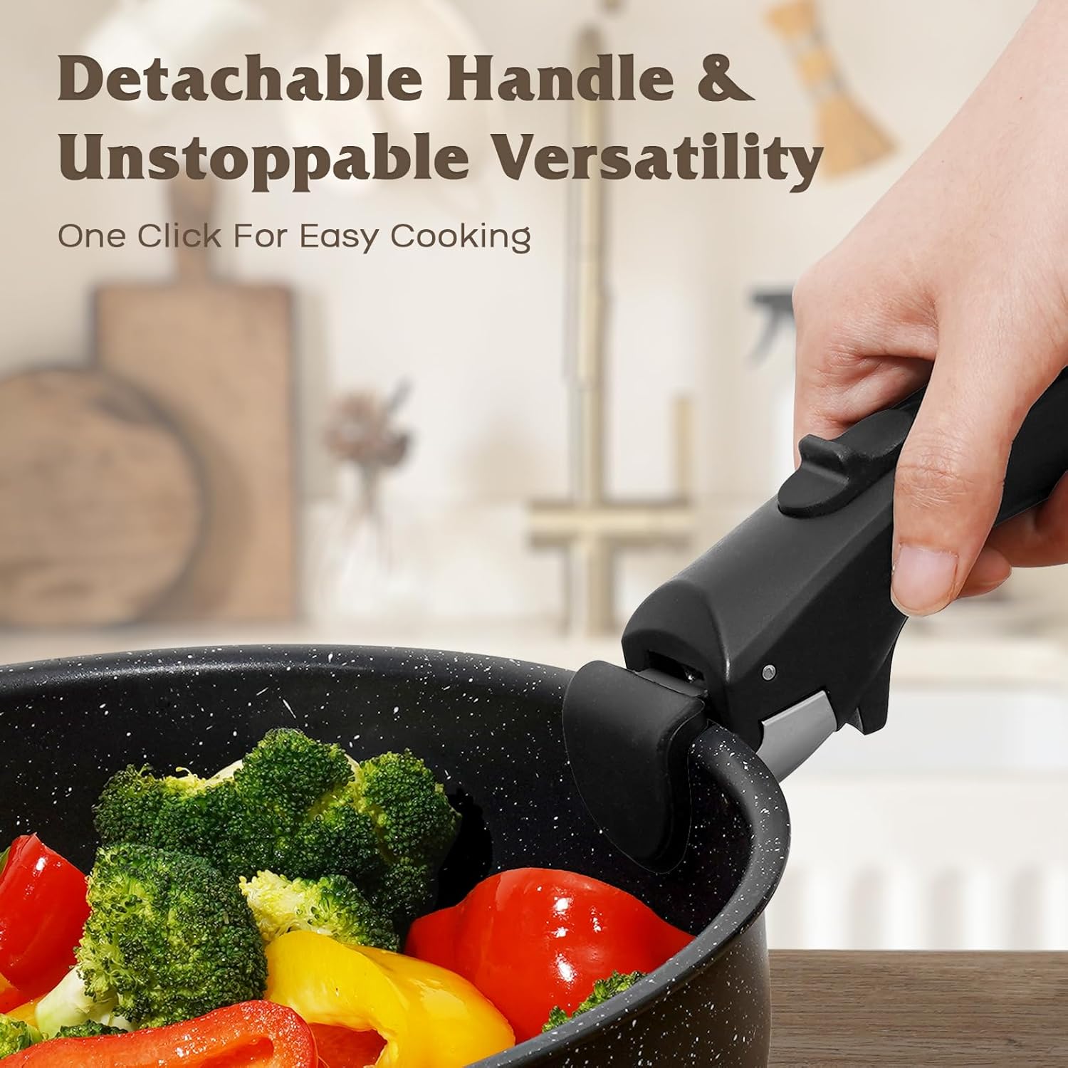Nonstick Excellence: Crafted with a premium nonstick coating, our detachable handle pots and pans set ensures a seamless cooking and cleaning experience. Enjoy the freedom to cook with less oil and experience effortless food release, making your favorite recipes healthier and more enjoyable