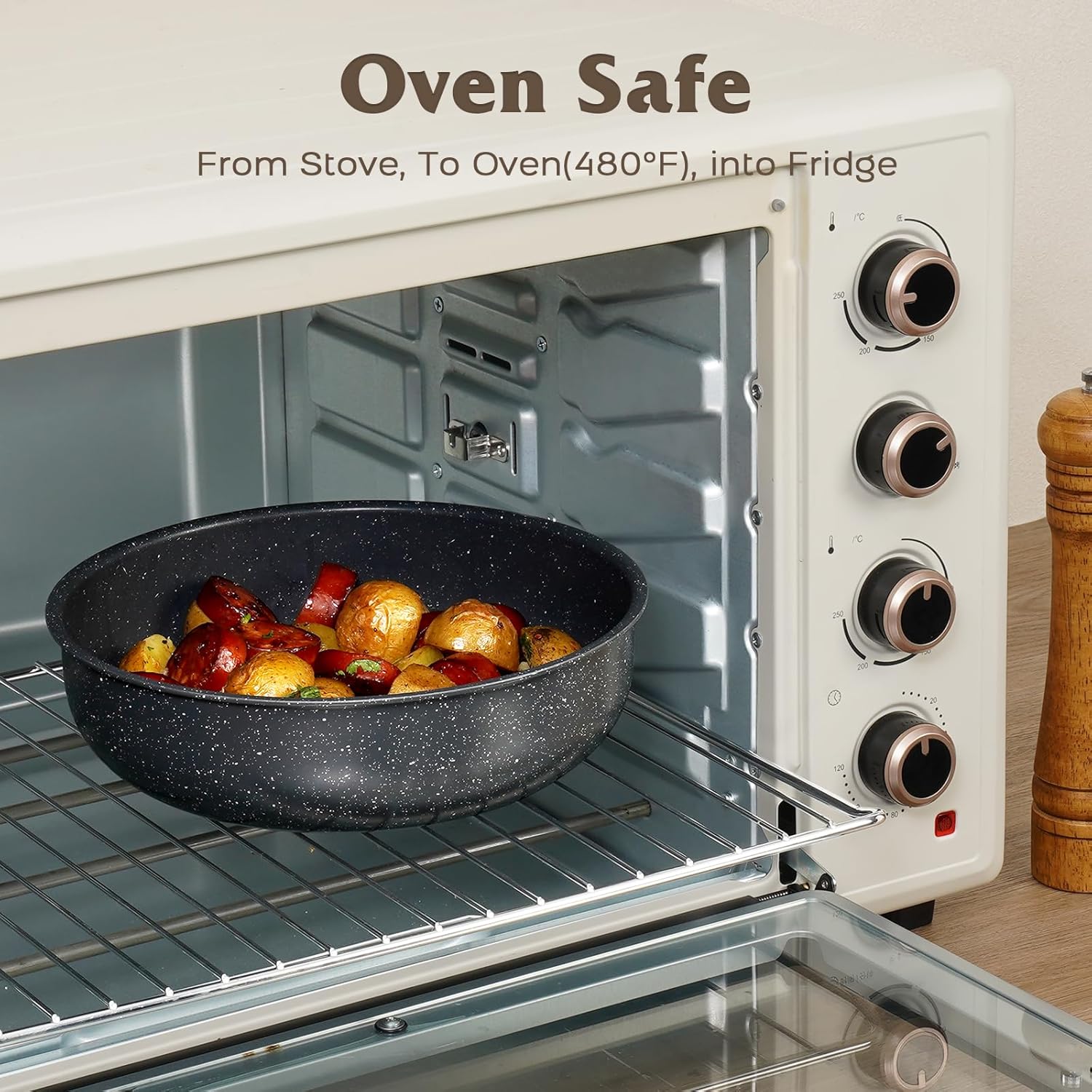 Premium Granite Non-Stick Coating: Superior granite coating for smooth, ultra-non-stick cooking; food slides off effortlessly without sticking. Non-toxic and Non PFOS & PFOA,SGS Approved cookware sets allow you to cook healthy and safe