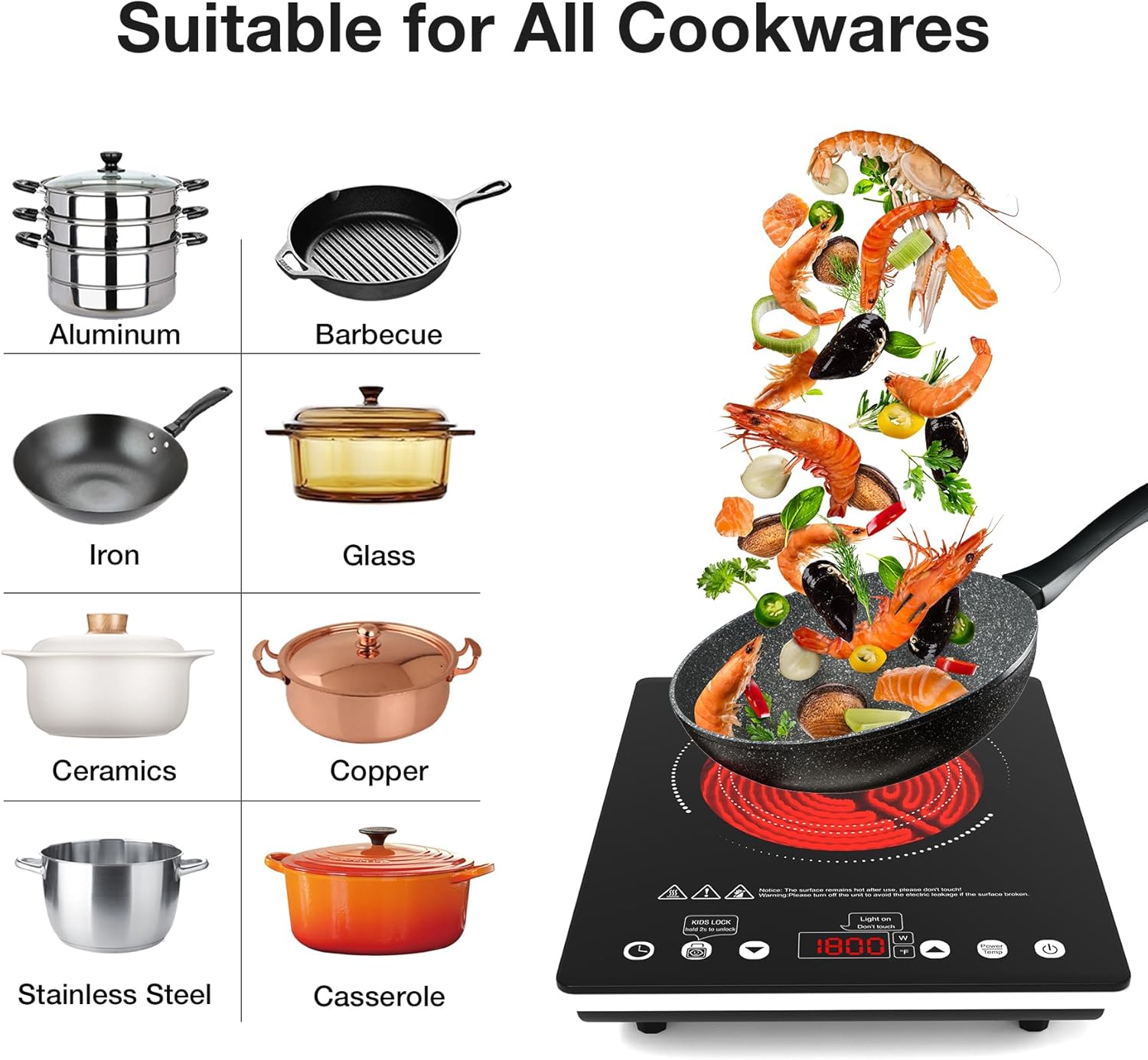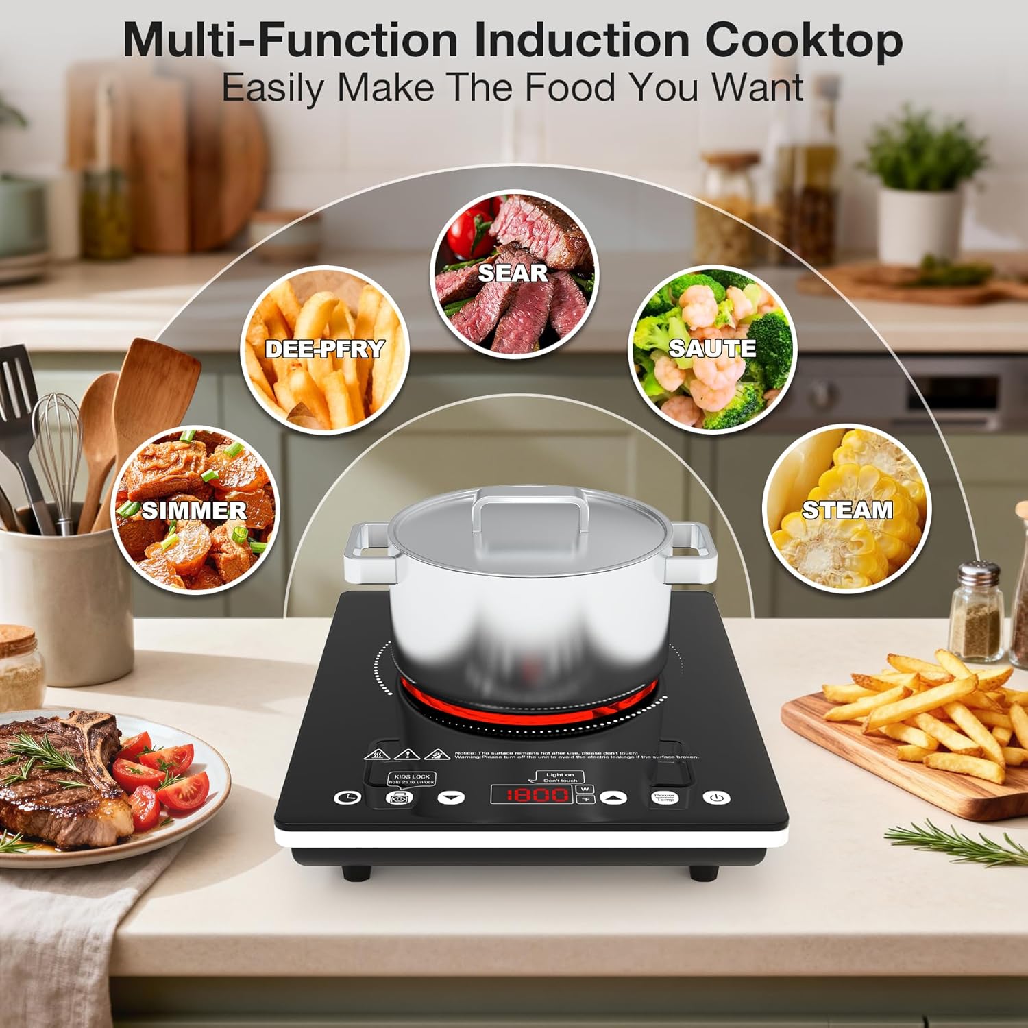 High-Powered Performance: Experience rapid heating with our 1800W Induction Cooktop, designed to efficiently cook your favorite meals in no time. This Electric Countertop device is perfect for both home and travel cooking