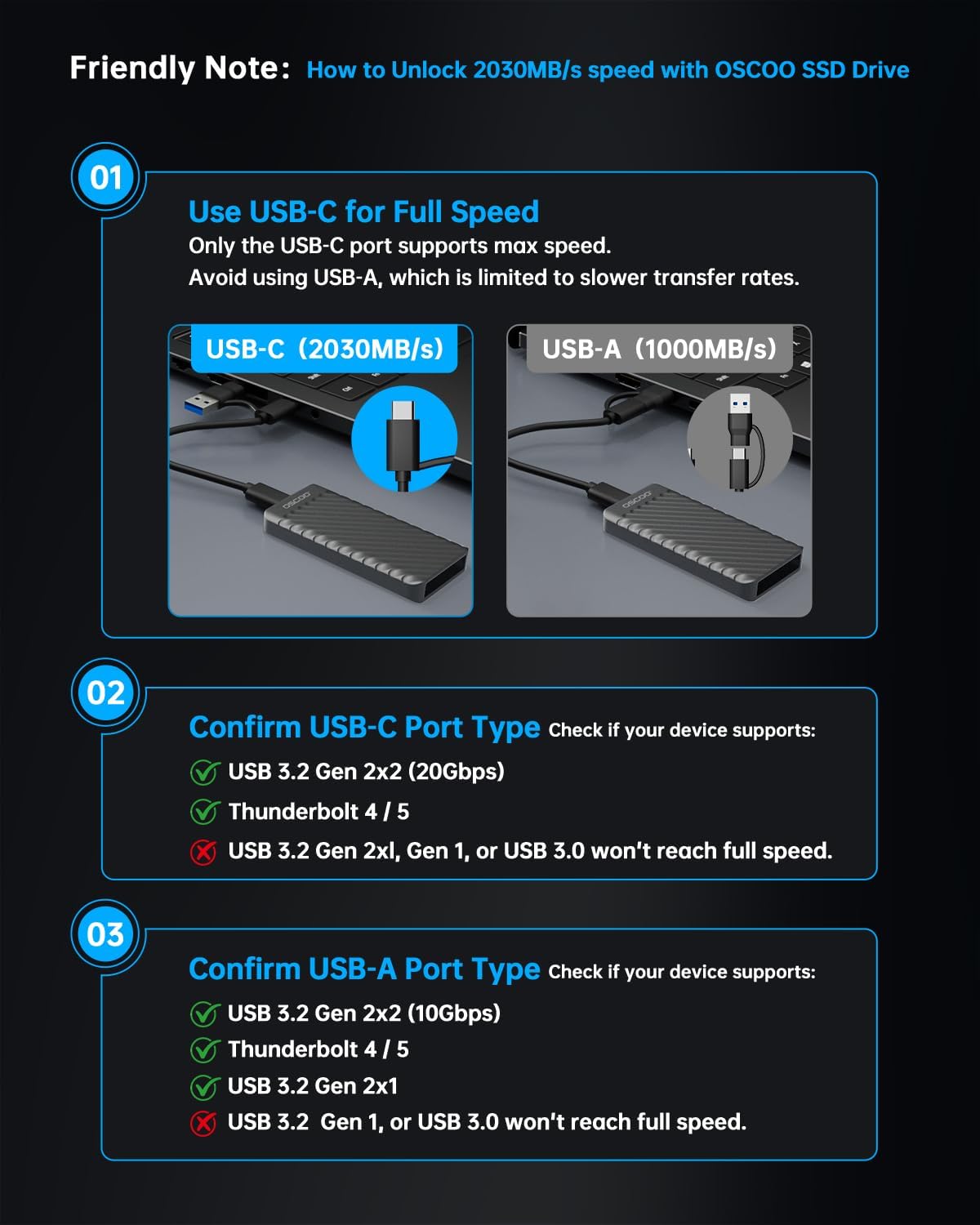 The PSSD can deliver read speeds of up to 2000MB/s under ideal conditions, depending on the device’s USB port and system configuration. To test speeds of up to 2000MB/s, please use a high-performance PC and ensure the port is USB 3.2 Gen 2×2 or Thunderbolt 4/5 and above. If using an older or lower-spec PC with only USB 3.2 Gen 2 / USB 3.1 Gen 2 (10Gbps) or USB 3.0/3.1 Gen 1 (5Gbps) bandwidth limitations will reduce actual speeds to less than 1000MB/s or 500MB/s; on even slower USB interface