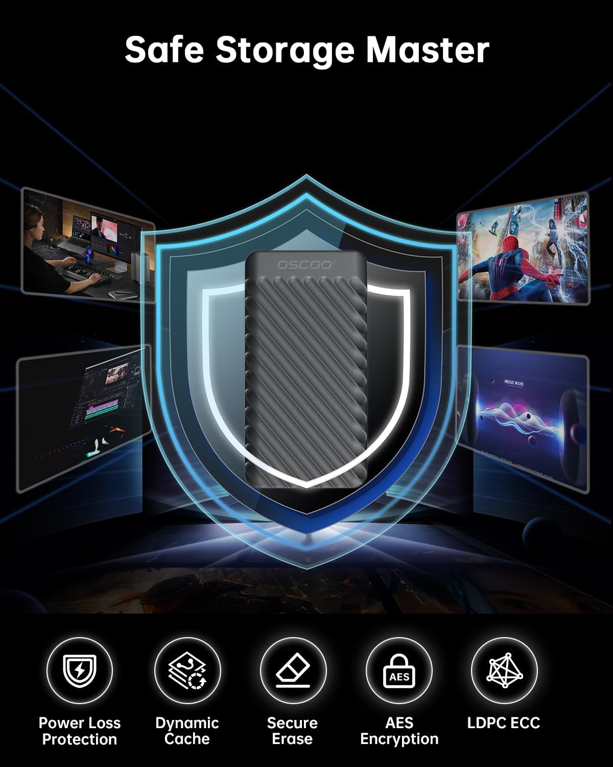 Built for Creators: Capture, edit, and transfer with ease. Powered by SSD technology and premium NAND Flash, this portable SSD delivers up to 2000MB/s—perfect for handling large 4K videos, RAW photos, and gaming assets. Maximum speed can reach 10Gbps with USB-A, please make sure your device’s interface USB 3.1 Gen 2×2 / USB 3.2 Gen 2