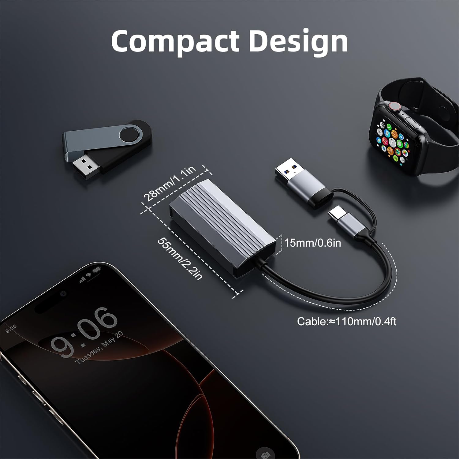 【Sleek and Strong】The ethernet adapter for laptop adopts high-quality aluminum. The ports are resistant to plugging and unplugging and the reinforced design makes it very durable for use. Crafted with a lightweight, pocket-sized profile, this device effortlessly slips into bags or pockets.