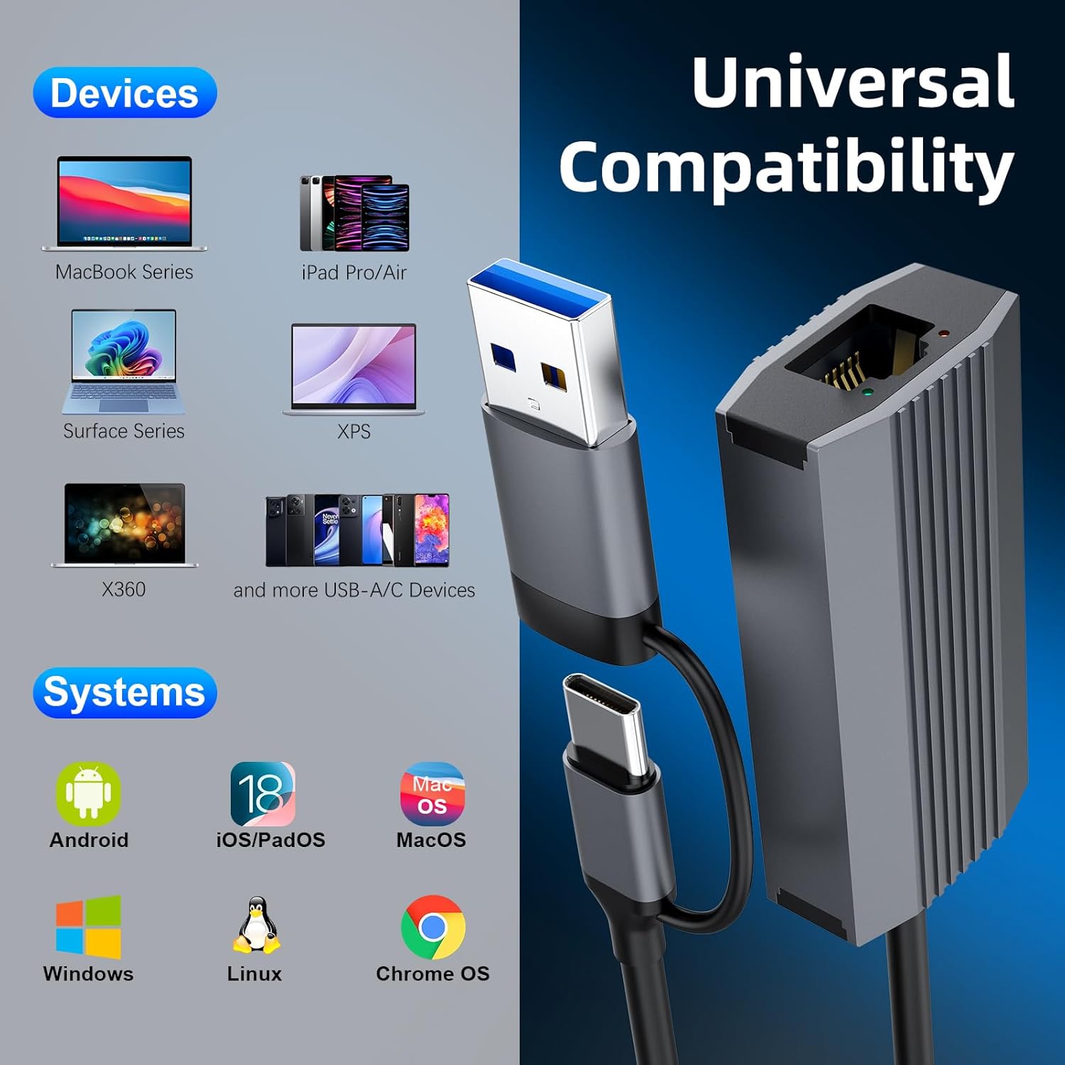 【2.5G Ethernet Adapter】 USB A USB C to ethernet adapter supports a internet speed of up to 2.5Gb and enables your devices to run at full speed. Enjoy unbelievably fast downloads with NAS, fluent 4K/8K streaming, immersive gaming.