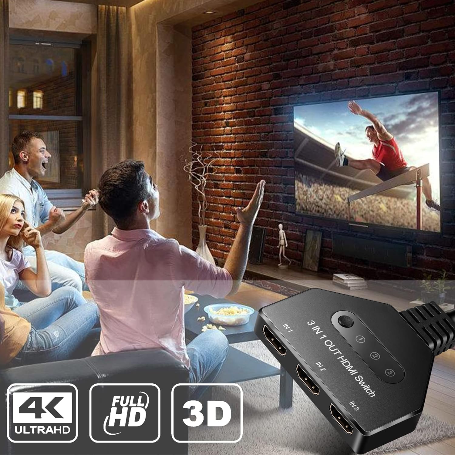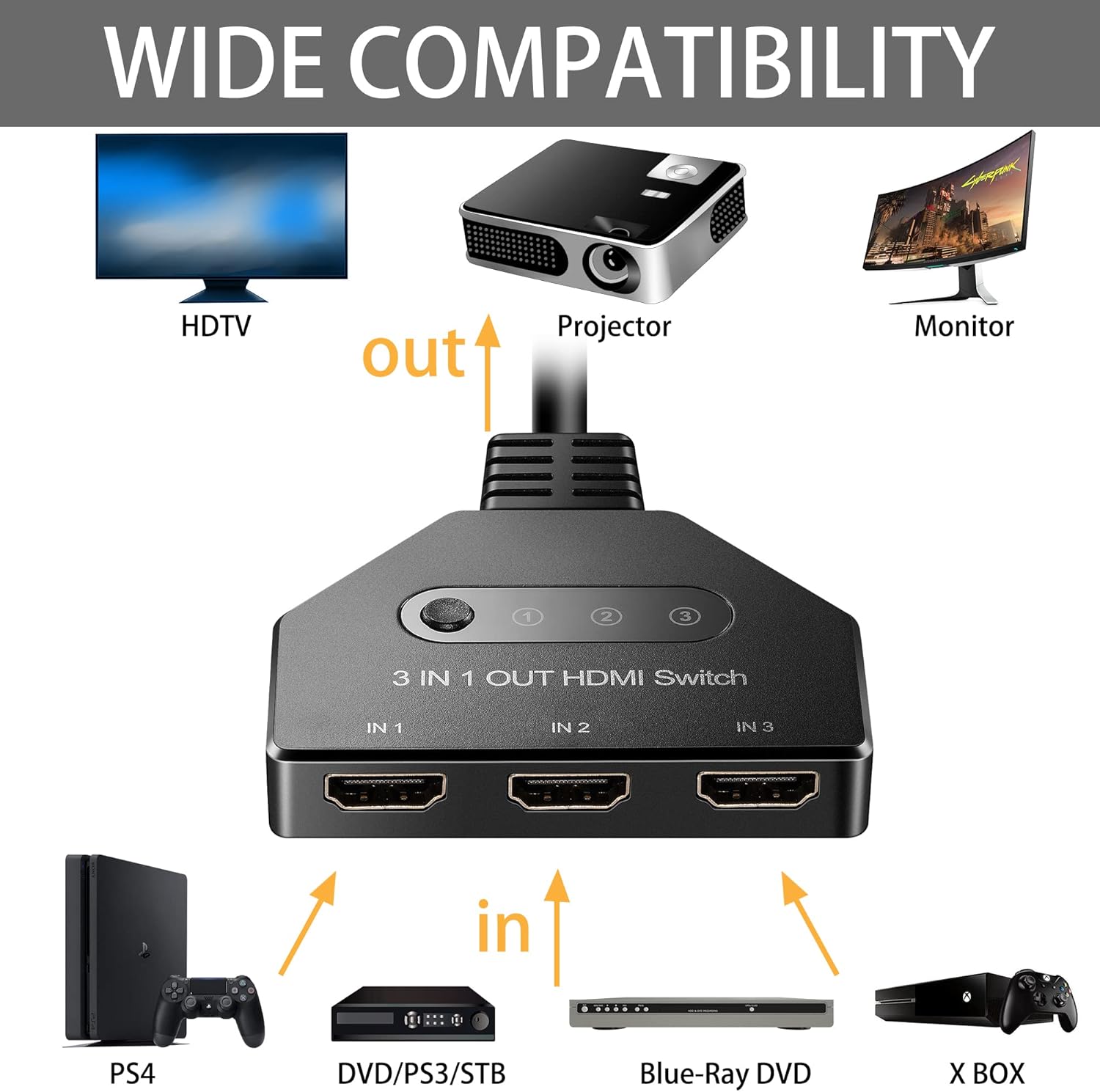 Wide Compatibility: This hdmi port expander has 3 ports for input which can work with most devices with standard HDMI interface. Input: PC, Laptops, PS3/PS4, Roku Express, Fire TV Stick, Blu-ray DVD, etc; One Output for Full HD TVs, projectors, monitors and more.