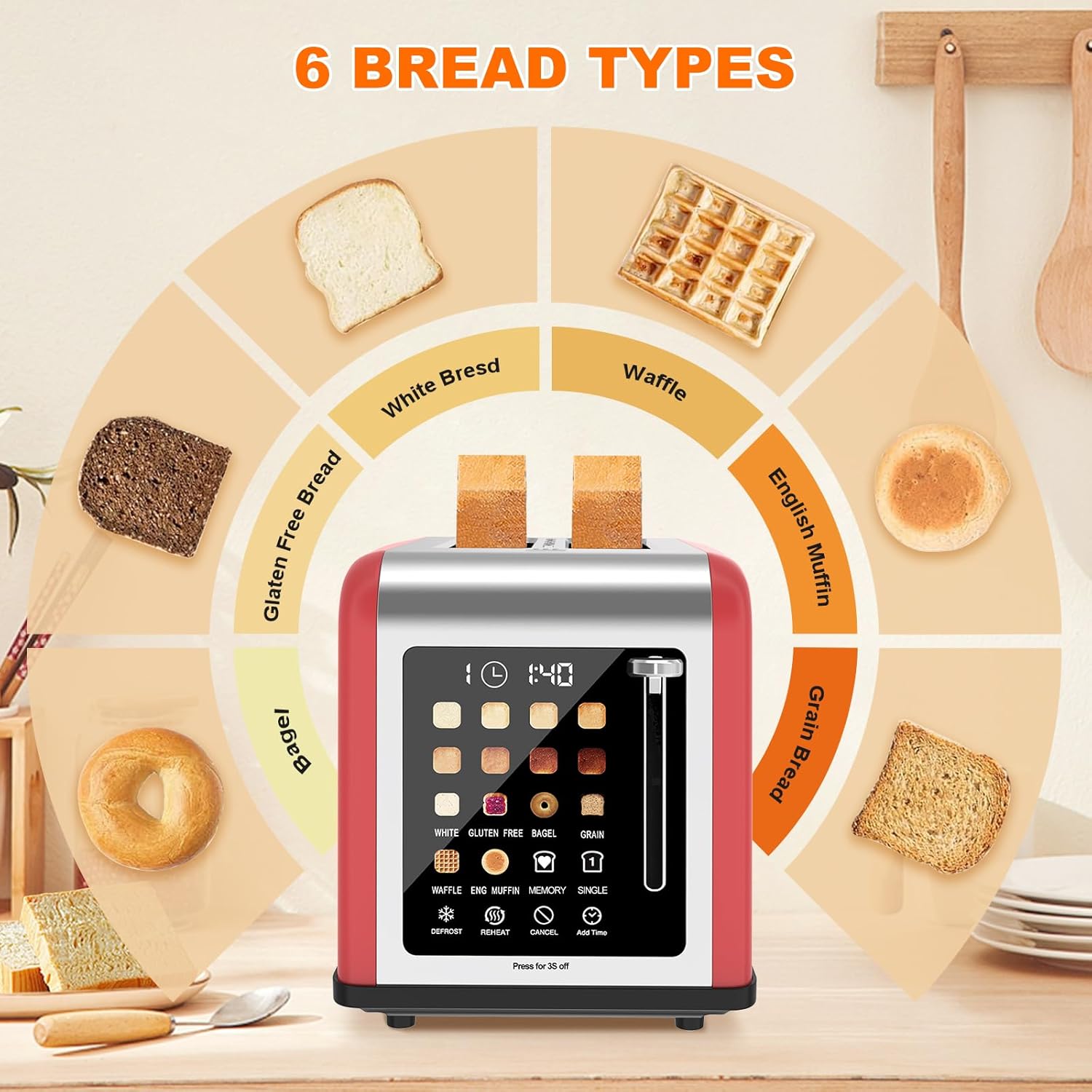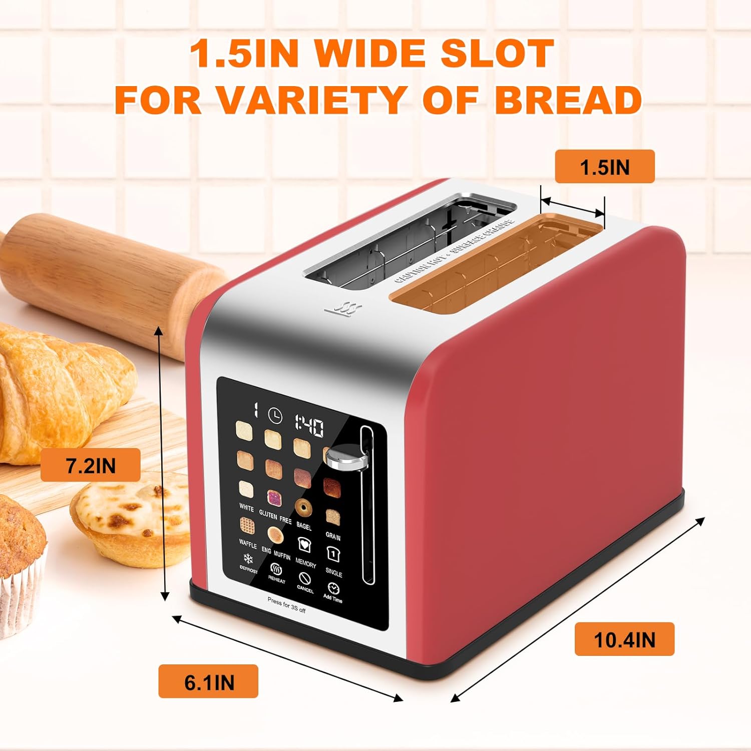 2 Slice Toaster Touch Screen, Stainless Steel Toasters Digital Timer 2 Slot Toasters, 8 Shade Settings 6 Bread Types for Bagel, Cancel, Defrost (Red)