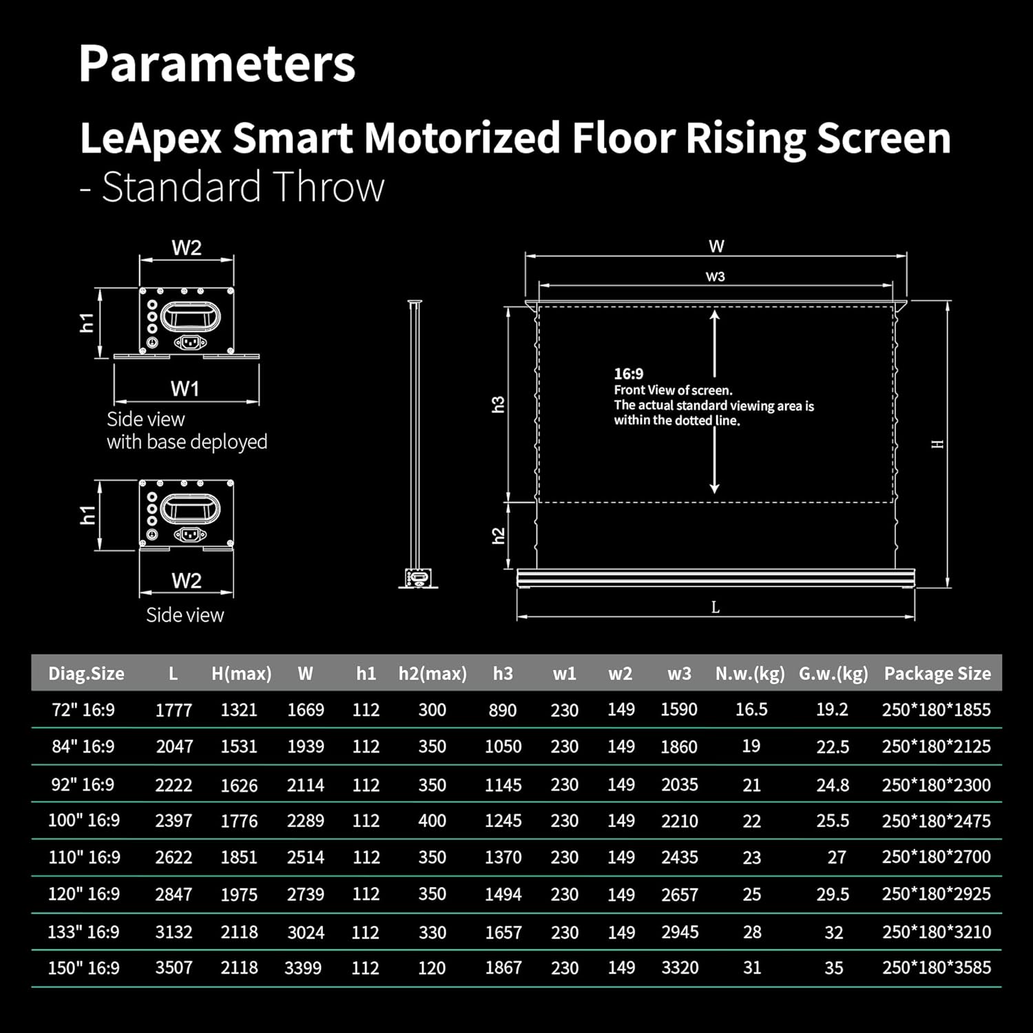 To avoid purchasing an incompatible projection screen and potential inconveniences, please carefully check the specifications table before purchasing. If you still have questions about your selection, please contact us and we will recommend the most suitable screen for you. Given the large size of the screen, it is essential to measure the dimensions of your room, lift and corridors to ensure that the selected size fits your space.