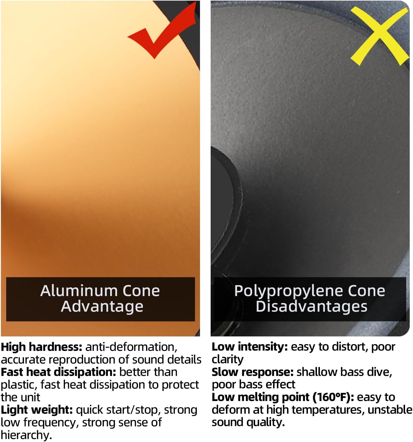 **Premium Build Quality** – Features durable Aluminum Cones, sturdy Aluminum alloy basket with, and high-temperature voice coils for long-lasting performance in all weather conditions,Endure the most intense improvisation without compromising quality, ensuring that your music plays for as long as you want