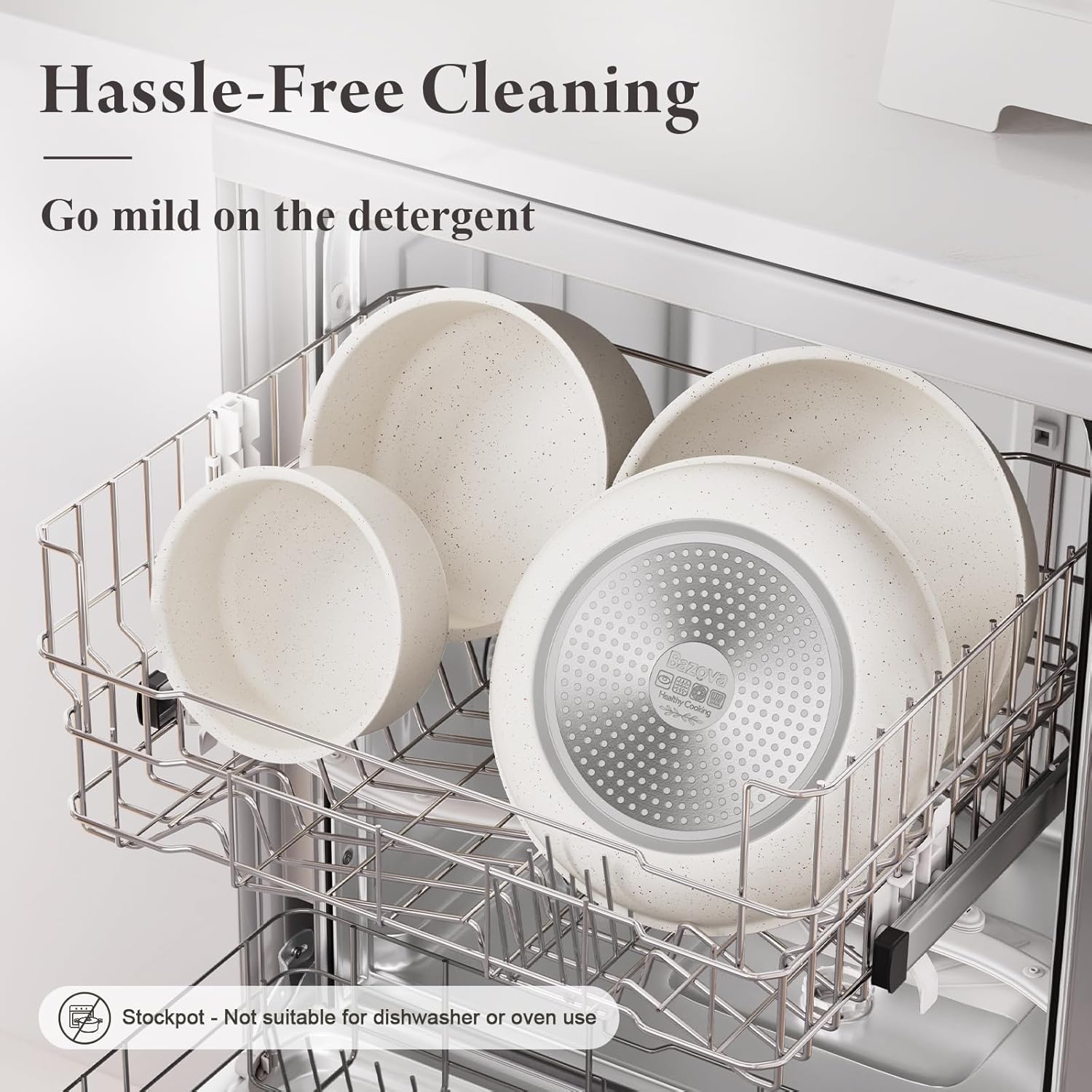 Easy to Clean: This ceramic cookware set is dishwasher-safe, but for optimal longevity, we suggest hand washing. Simply detach the handles when not in use and easily wipe or rinse your pots and pans to keep them looking brand new.