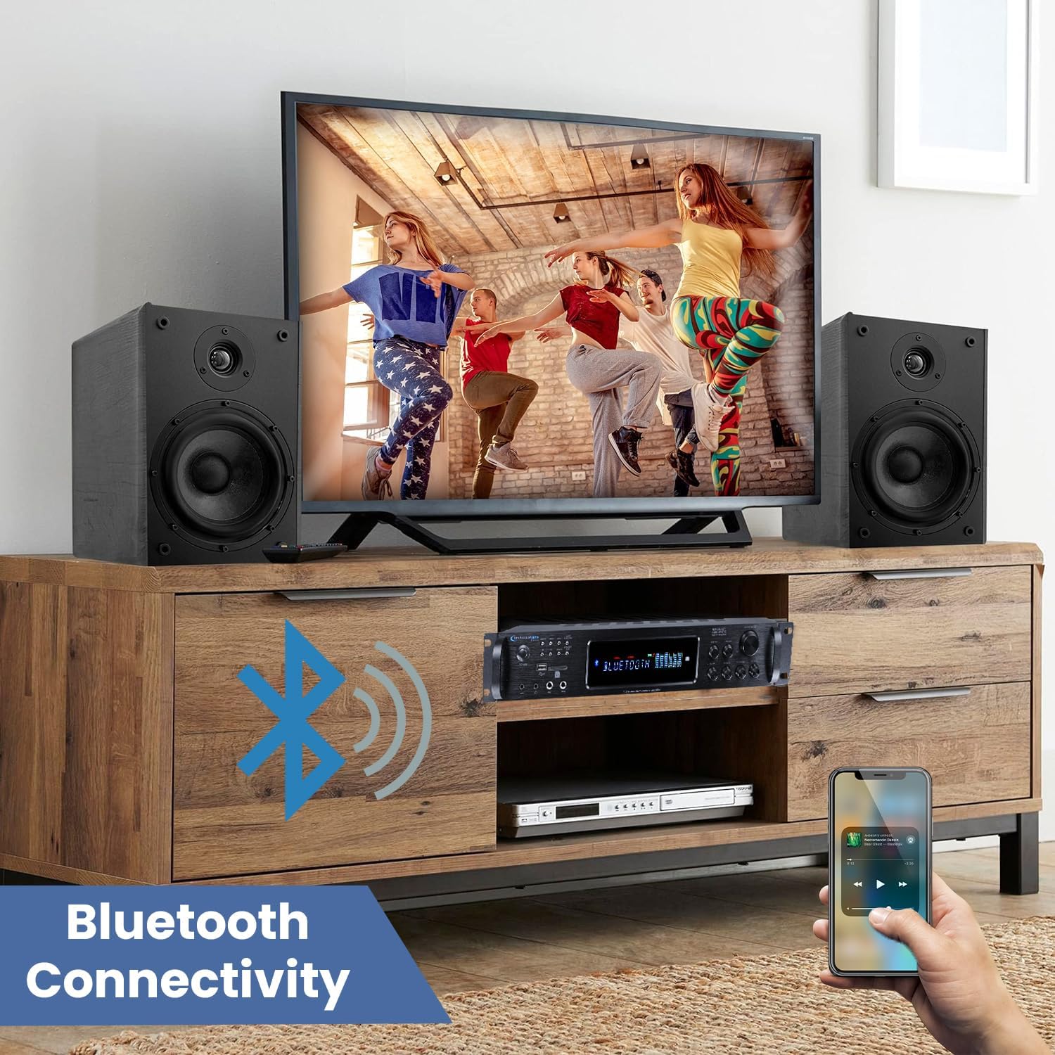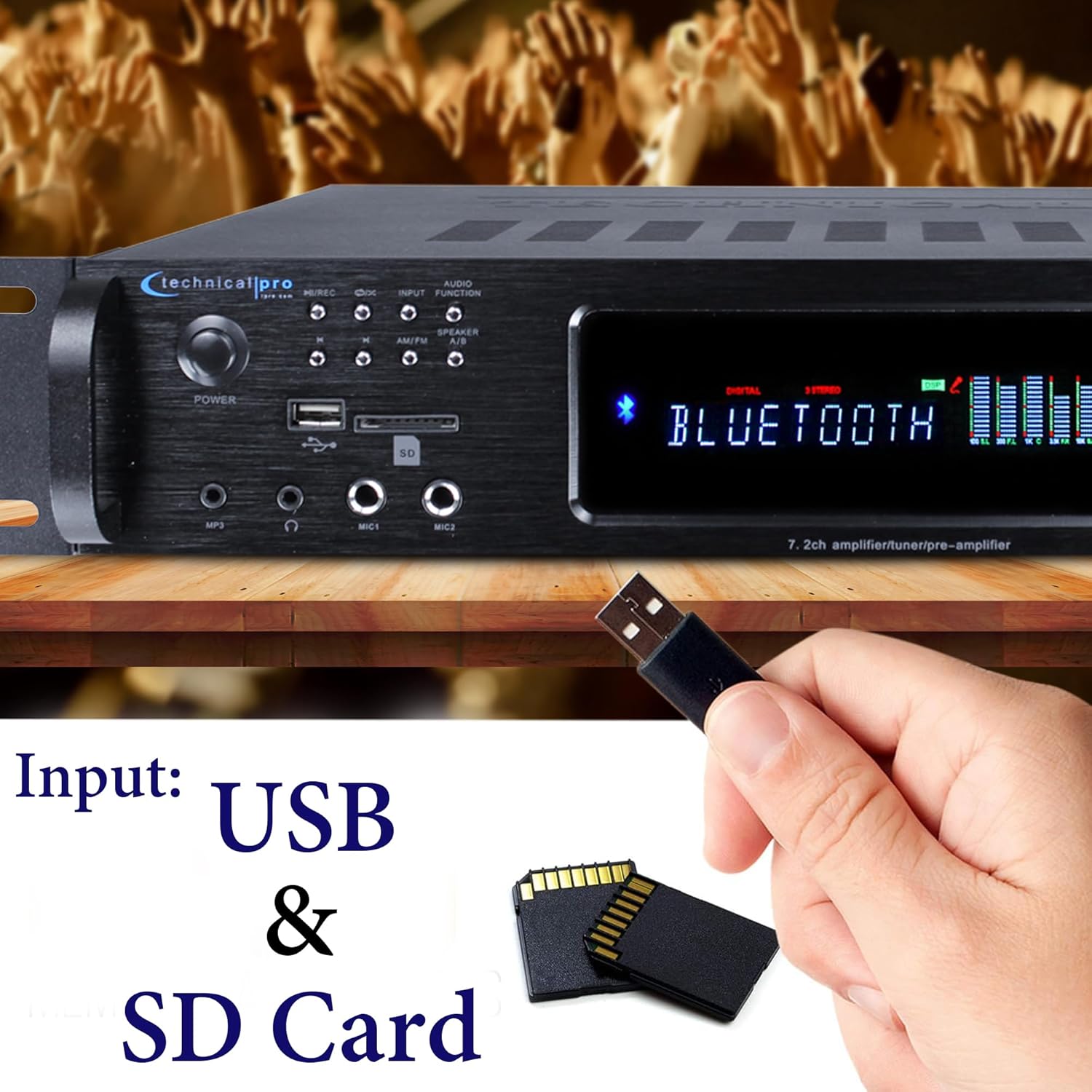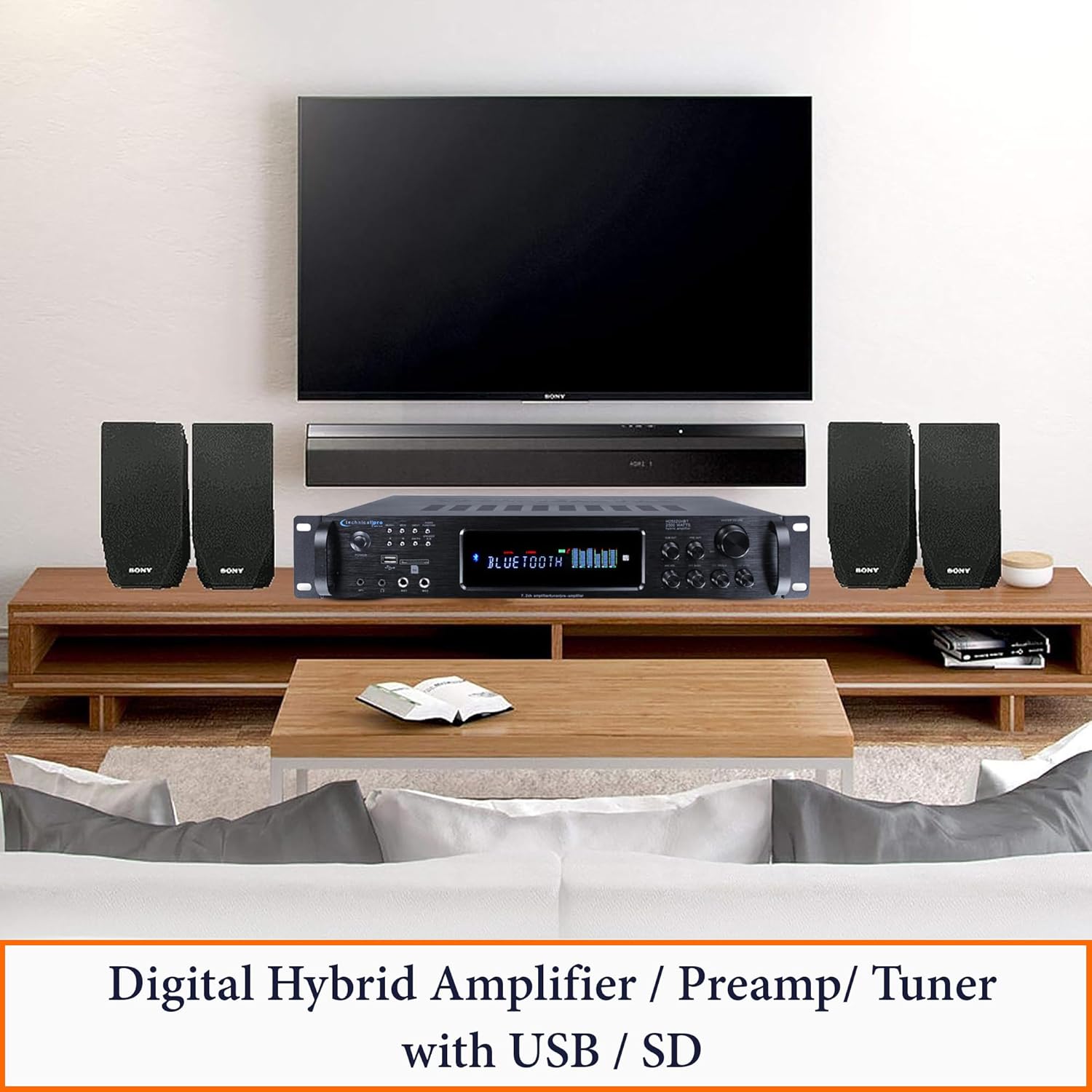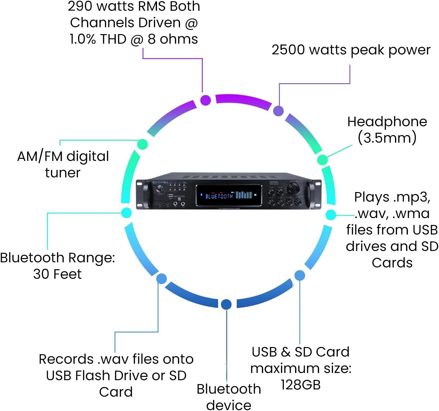 2500 Watts Digital Hybrid Amplifier, Preamp/Tuner with USB and SD Inputs, 2 Mic Inputs, AM/FM Digital Tuner, Wireless Remote, Bass & Treble Controls, FM Radio, Recorder, Bluetooth by Technical Pro
