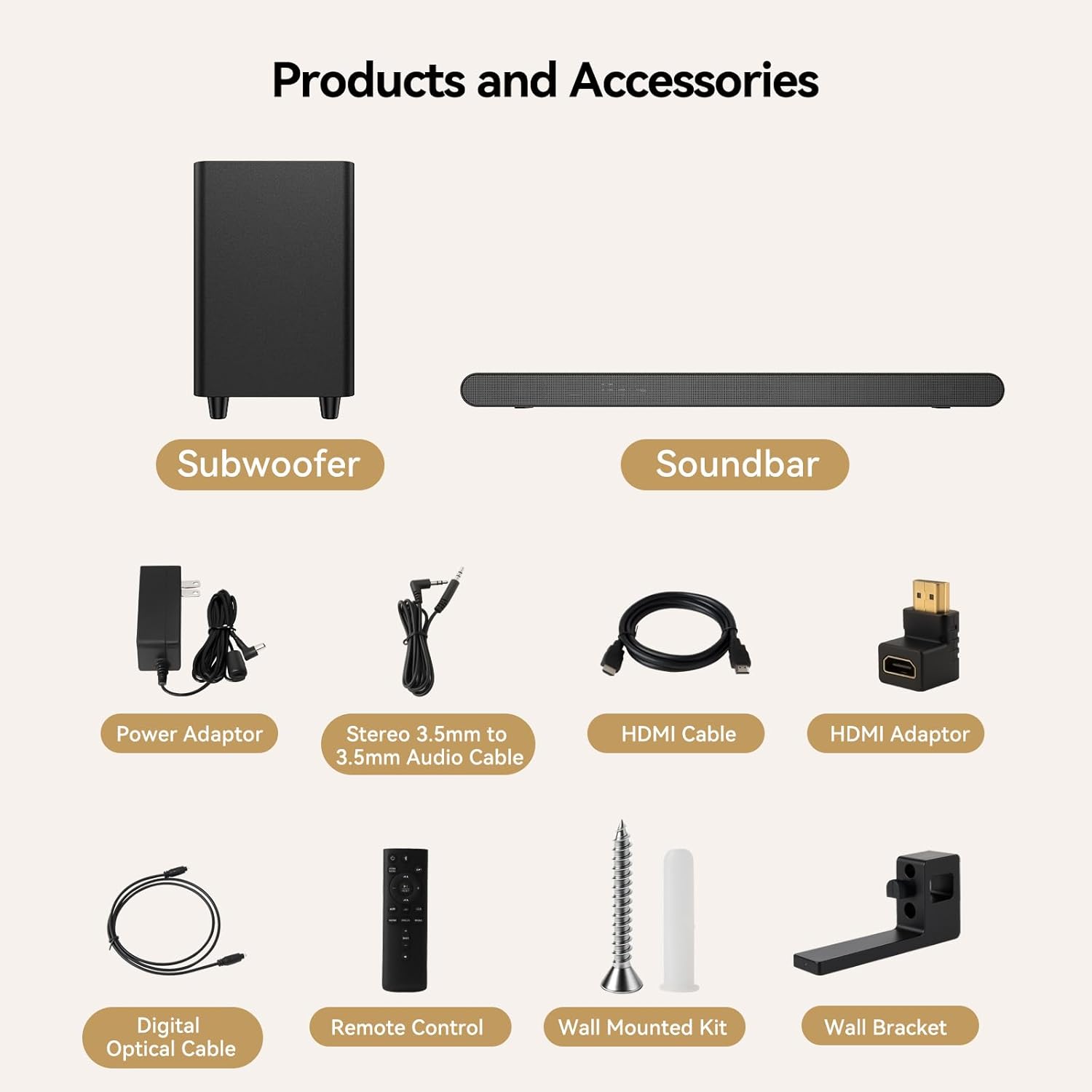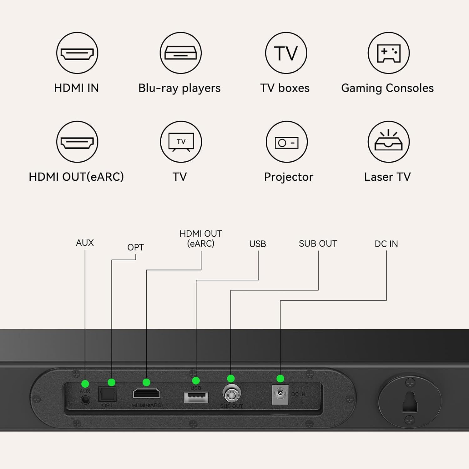 4K HDR Soundbar with HDMI Passthrough:Direct 4K HDR signals to your TV via HDMI IN. Sync vivid colors and 3D audio for PS5/Xbox/Blu-ray. Bluetooth 5.3 soundbar pairs with phones/tablets.