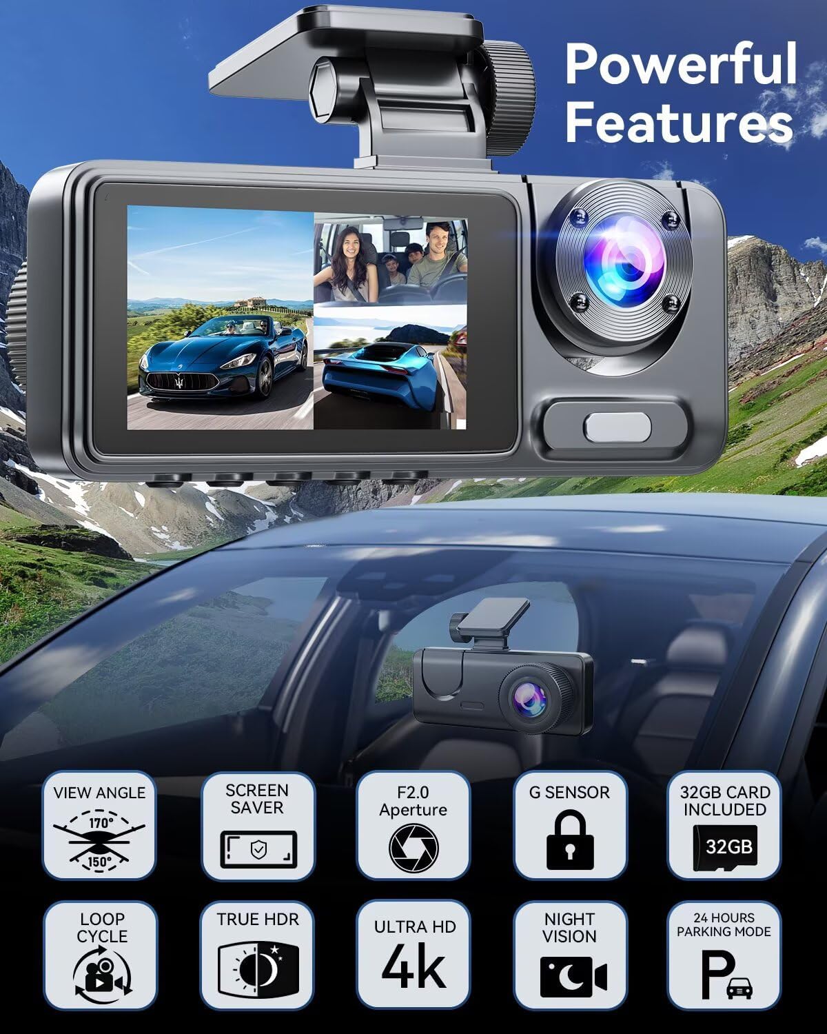 【Car Camera – Front and Rear Dash Camera】The 3-channel dash camera features a rugged, heat-resistant chipset and adhesive pads that securely fasten to the windshield and maintain reliable performance in extreme temperatures (-40°F to 185°F). It comes with a U3 32GB memory card for seamless recording. Once the storage limit is reached, it automatically overwrites old footage and detects sudden impacts to lock and save critical footage.