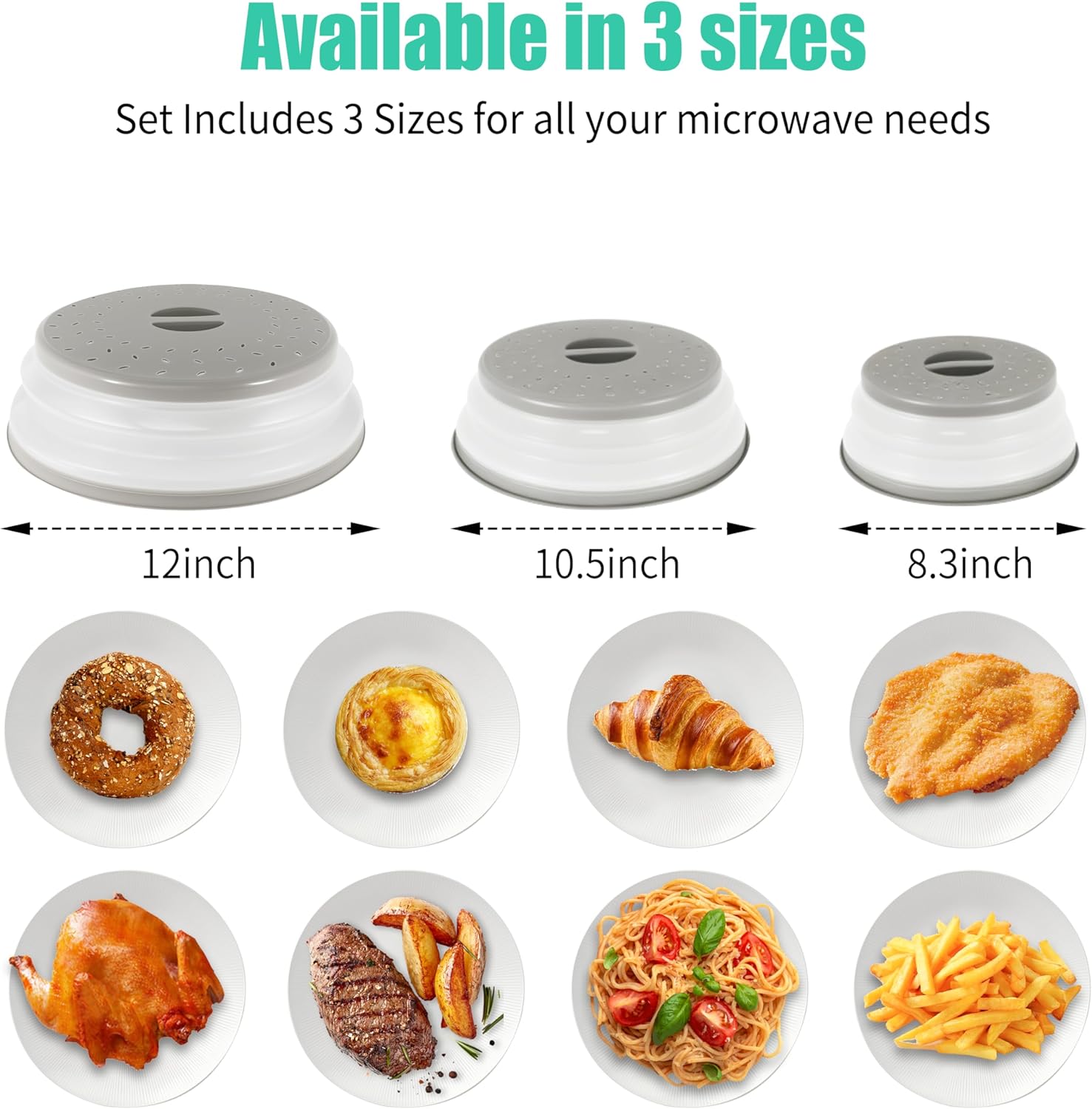 The sizes of the three microwave oven covers are 12 inches, 10.5 inches, and 8.3 inches, respectively. They can easily be stored in any cabinet, cupboard, or drawer for easy storage.