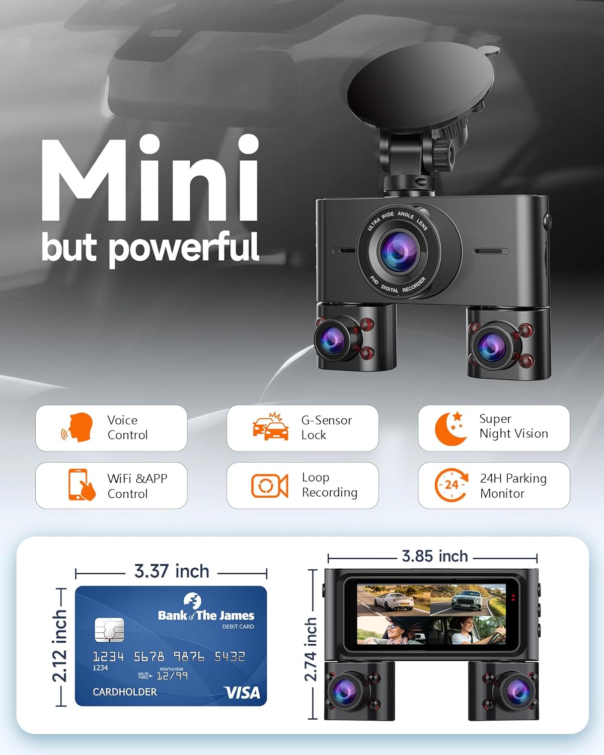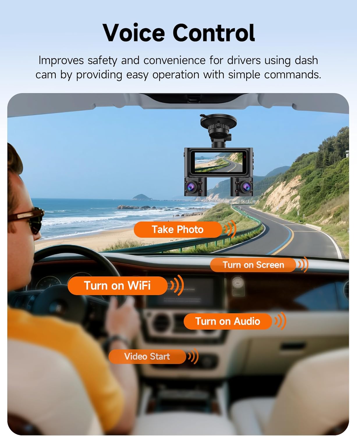【Voice Control Dash Camera】The dash camera with voice control function allows you control the dash cam with spoken commands (in English), so you can keep your hands on the steering wheel and focus on safe driving. All you need to do is say commands to take photo, start video, turn on/off audio, turn on/off WiFi, turn on/off screen, etc. Everything will be easier and more convenient. (NOTE: Only the voice option in the menu is supported). If you have any questions, please email us anytime