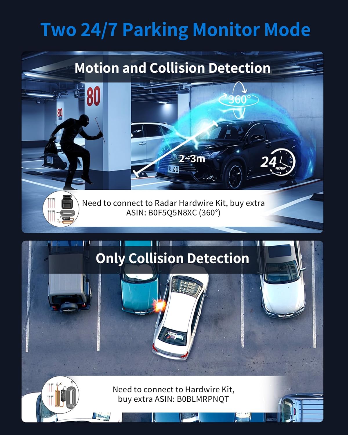【24/7 Parking Monitoring Dash Cam】When you park and turn off your vehicle, dash cam will automatically switch to parking mode, enabling 24 hours surveillance recording. Dash camera for cars has time-delay recording function to record continuously with low power consumption and low frame rate, providing 24 hours protection for your car. Please note that the parking monitoring function requires the purchase of a separate hardwire kit (ASIN: B0F5Q5N8XC – 360°)
