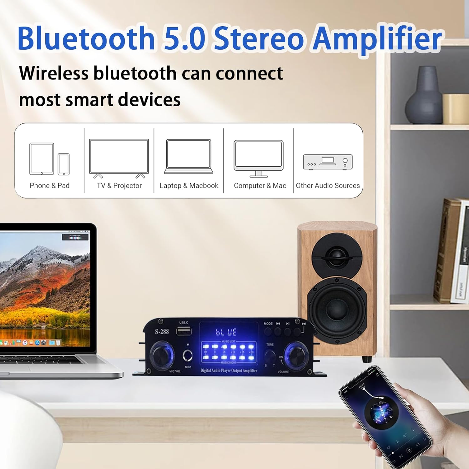 【Bluetooth Stereo Amp】Built-in latest bluetooth 5.1 core, giving you a wide operating range of 33 feet, designed for the customers who pursue HiFi sound.Compatible with mobile phones, computers, tablets, laptops, etc. Recommended for home audio, computer game audio systems, outdoor speakers, garden speakers.