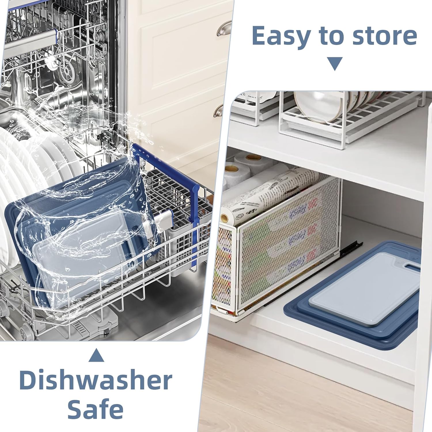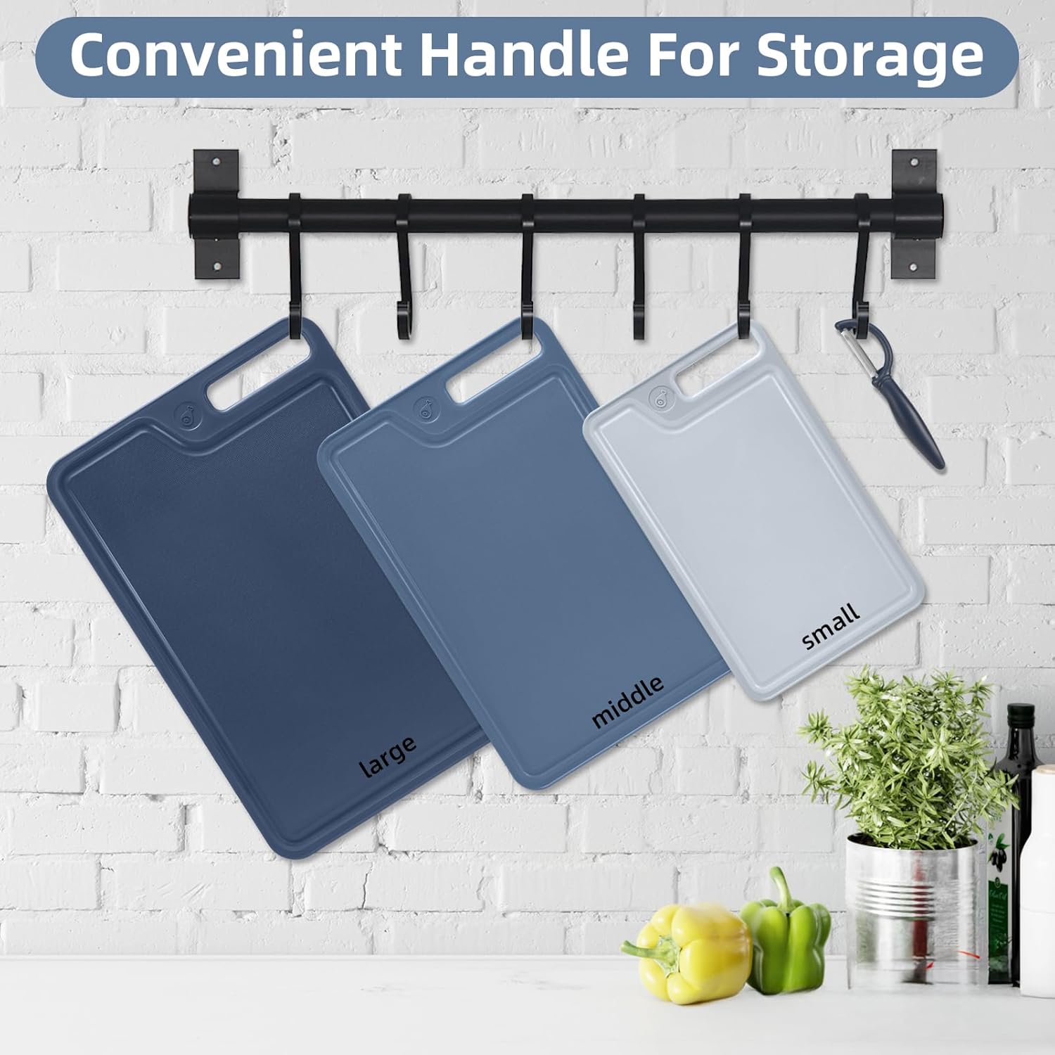 Easy to clean and store:All cutting boards are dishwasher safe (cutting boards for kitchen dishwasher safe), saving time and effort. Convenient designed handle that can be held securely and hung on the kitchen wall, without taking up space, making them an ideal choice for modern kitchens.