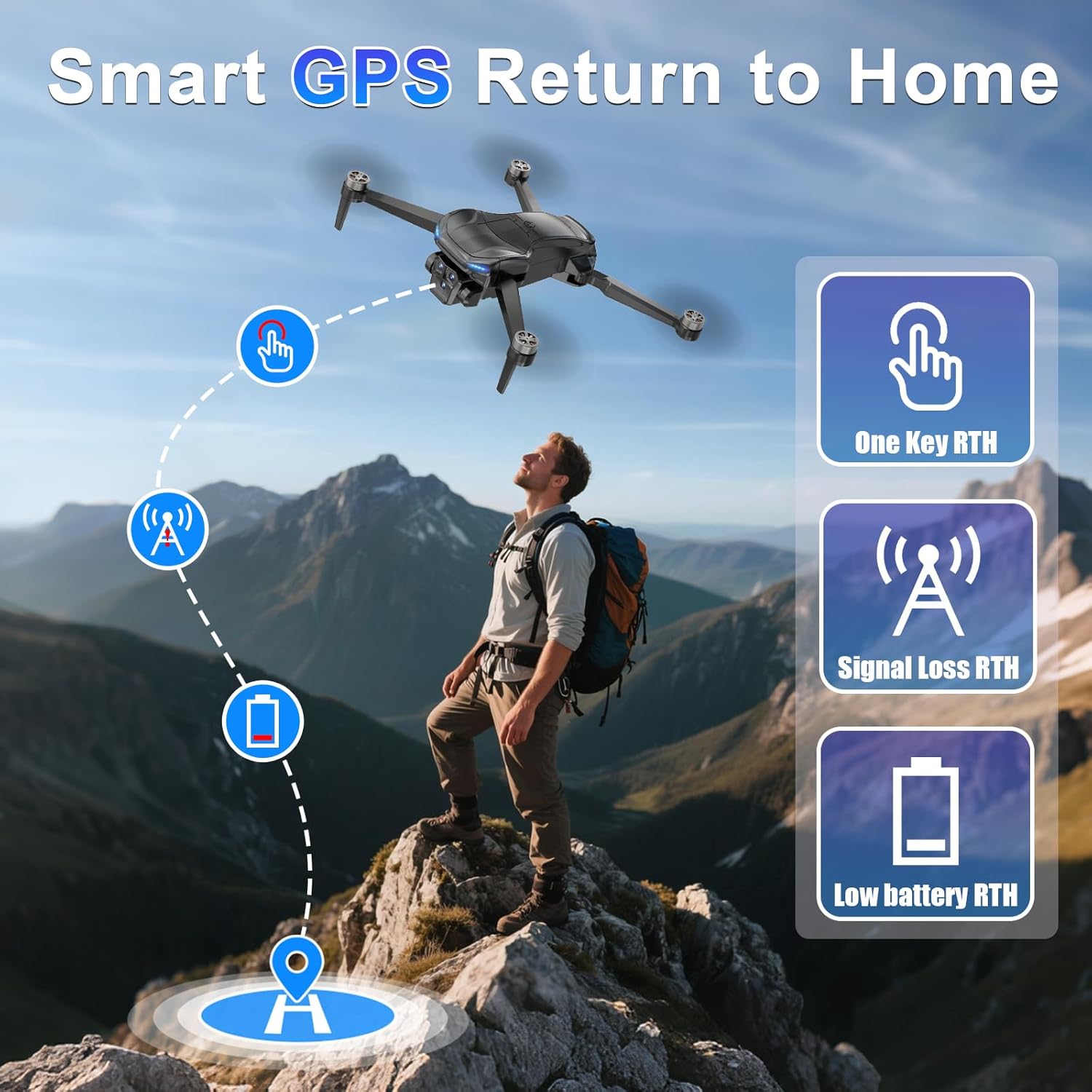 Long Flight Time & Brushless Motor: Equipped with two batteries, this 4k camera drone delivers up to 60 minutes of total flight time (approximately 30 minutes per battery). The powerful brushless motors provide smoother, faster, and quieter flights, while also ensuring a longer lifespan—giving you a reliable and worry-free flying experience.