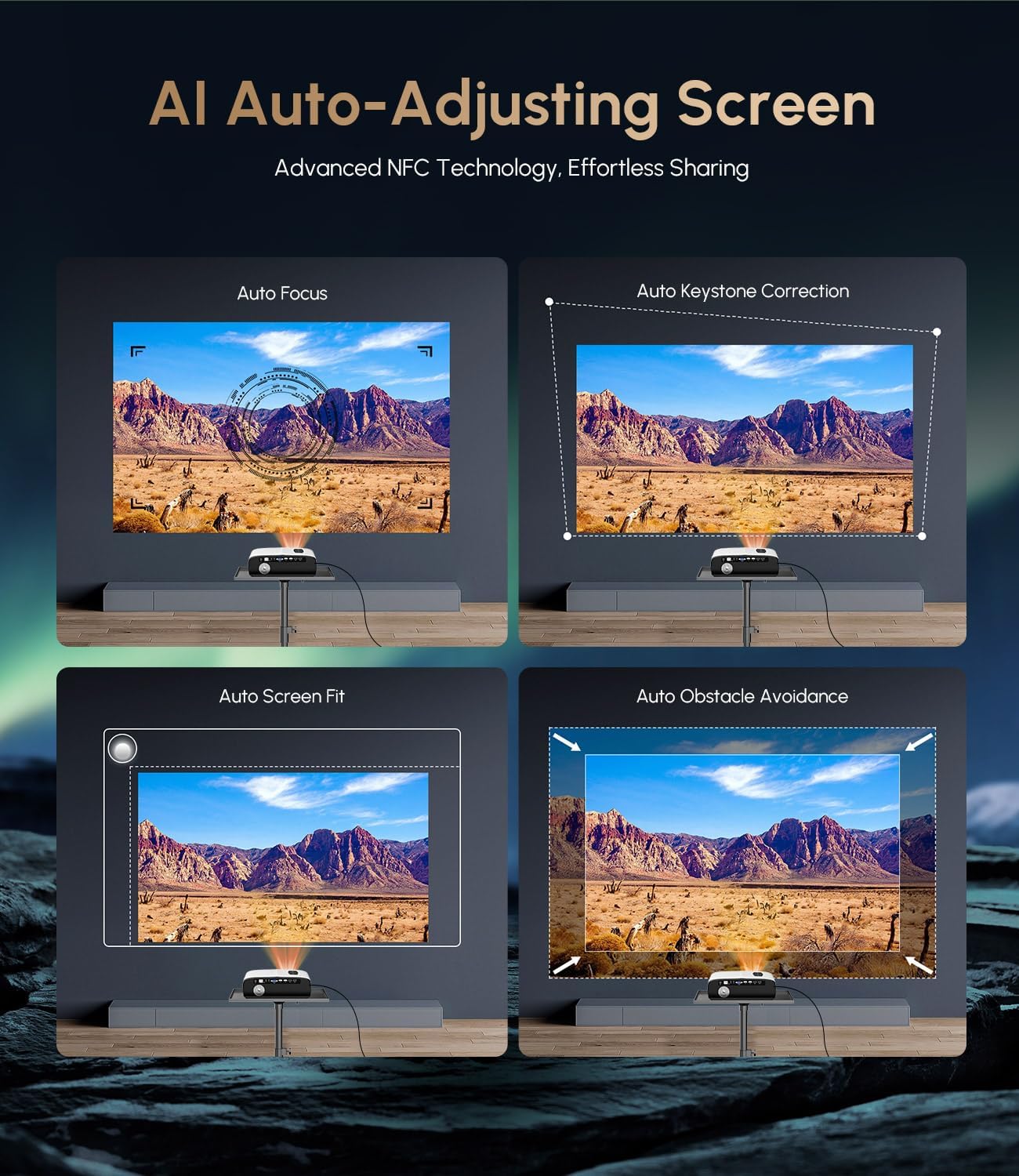 [ Auto Set Up in 3 Seconds, Precision and Speed ] This smart projector features auto focus and 6D keystone correction (±50° horizontal and vertical). With advanced focus technology and a 30W camera gyroscope, it adjusts in real time for optimal clarity
