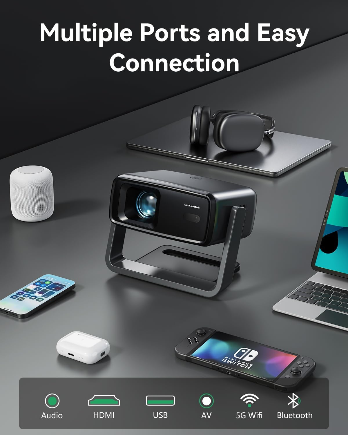 [Dual-Band WiFi 6, Bluetooth 5.2, and Screen Mirroring]: Equipped with WiFi 6 and support for 2.4G/5G/6G networks, this projector provides faster, more stable wireless streaming for smooth entertainment anywhere. The Bluetooth 5.2 mini projector easily pairs with Bluetooth speakers, headphones, or soundbars to elevate your audio experience. It also supports screen mirroring from smartphones and computers, giving you the freedom to enjoy big-screen experiences anywhere—whether at home or on the go, it’s the ideal choice
