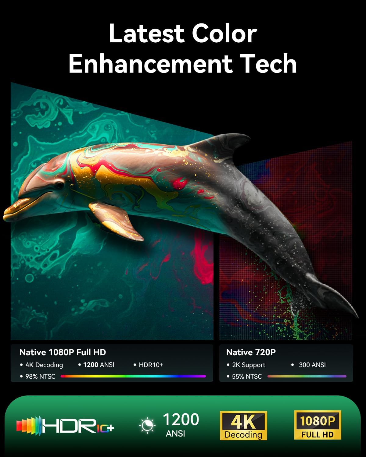 [Native 1080P | 4K Supported]: Experience stunning clarity with the Aubor Mentech 4K projector. Featuring native 1080P resolution (1920×1080) and advanced LCD technology, it delivers sharp, vibrant, and true-to-life visuals. Compared to standard 1080P projectors, brightness is increased by up to 95%, ensuring clearer details and brighter images. With 1200 ANSI lumens of brightness and 98% NTSC color gamut, every color pops with richness and depth. Plus, HDR10 support boosts contrast and sharpness, making every scene more vivid. Whether you’re watching outdoors, at home, or in your backyard, enjoy a cinema-grade viewing experience like never before