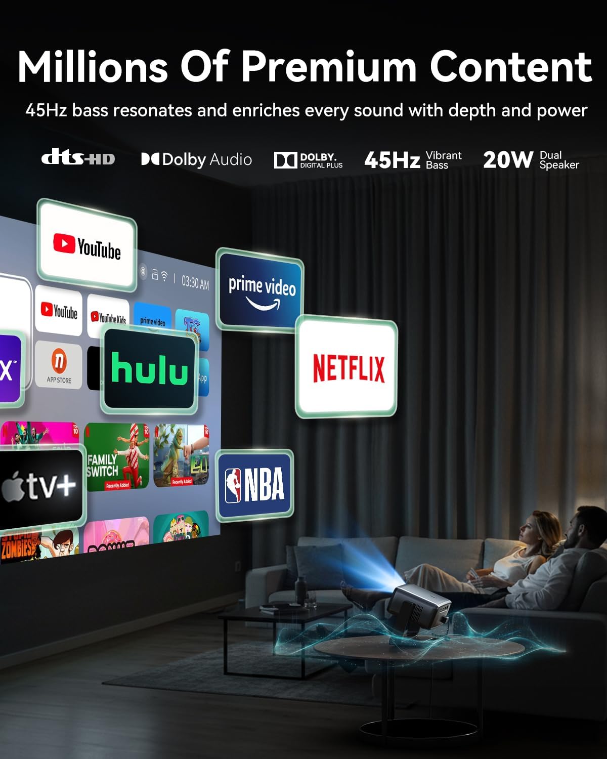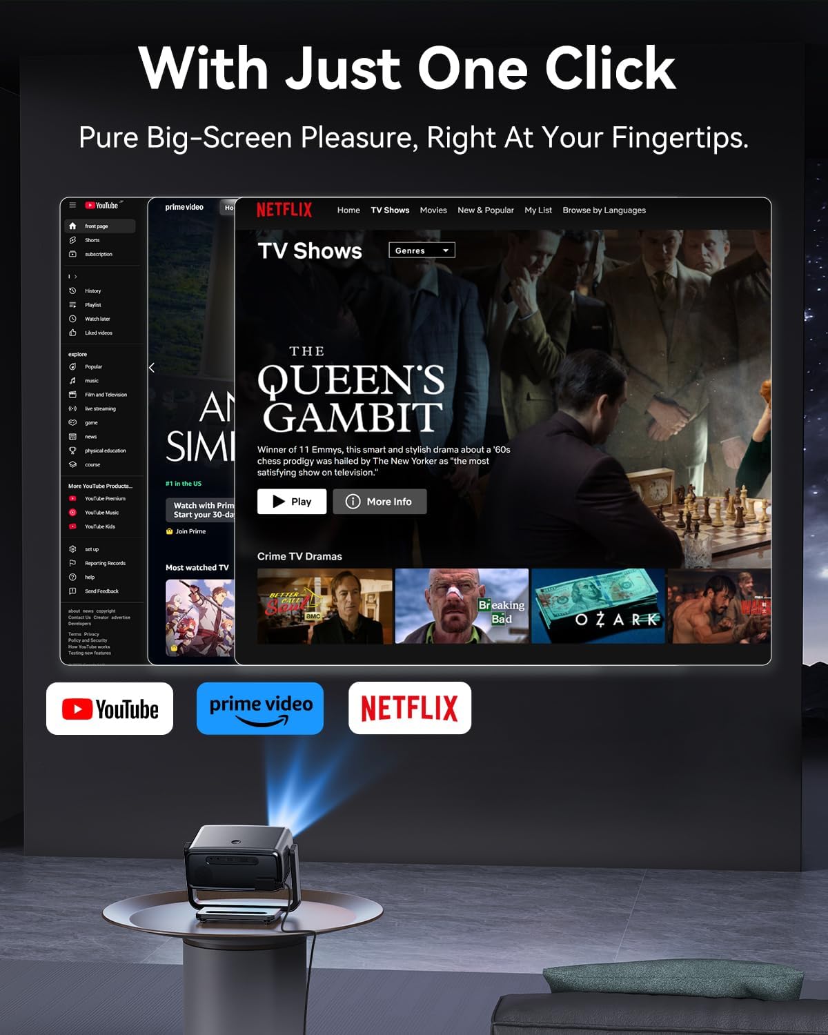 [Endless Entertainment – Built-in Smart OS with Official Streaming Apps]: This TV projector is deeply integrated with the global streaming ecosystem, offering direct access to Netflix, Prime Video, YouTube movies, and shows without the need for extra devices or adapters. Enjoy limitless exploration with regular OTA updates to ensure optimal performance, security, and functionality