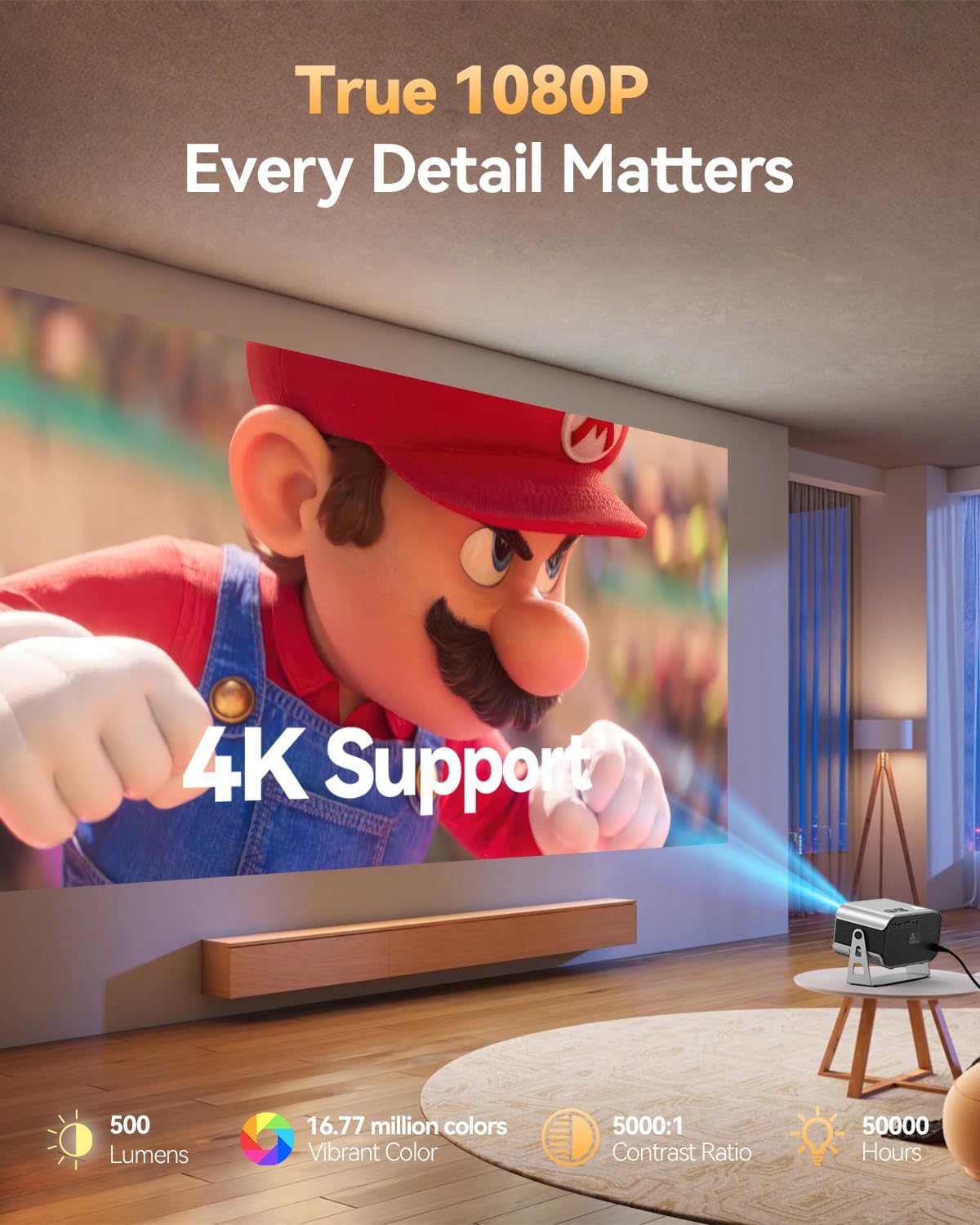 【True 1080P HD & 4K Support with 600 ANSI】Experience native clarity with this 1080P projector, featuring vibrant Projector 4K support. 600 ANSI lumens deliver a bright, sharp image in dim light. Ideal for movies, gaming, and presentations, this movie projector brings content to life day or night.