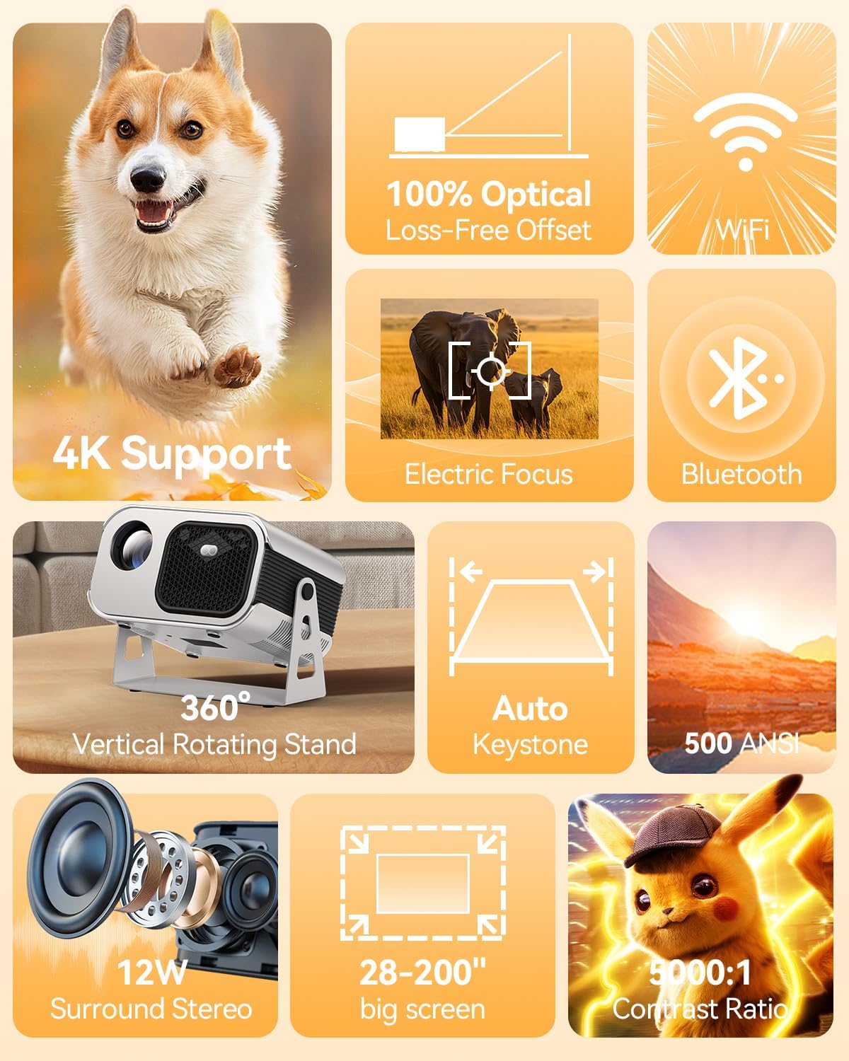 【Electric Focus & Auto Keystone: Instant Perfect Setup】Get a rectangular, sharp image in seconds. This outdoor projector features Auto Keystone Correction to remove distortion from angles. Electric Focus fine-tunes clarity remotely—no manual dials. Effortless setup every time.