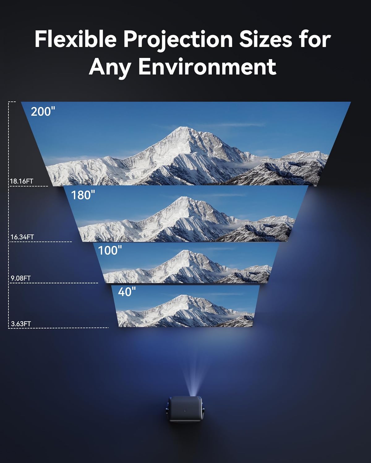 Auto Screen Adjustment, Instant Setup: This home projector features advanced sensor technology, elevating convenience to a new level. Auto Focus and Auto Keystone Correction ensure a seamless viewing experience. Enjoy an Instant razor-sharp image with precise auto focus, keystone correction(±45°), and effortless 50%-100% zoom without moving the projector. Auto obstacle avoidance and screen alignment images ensure a perfect fit every time, delivering true plug-and-play immersion with zero interruptions.