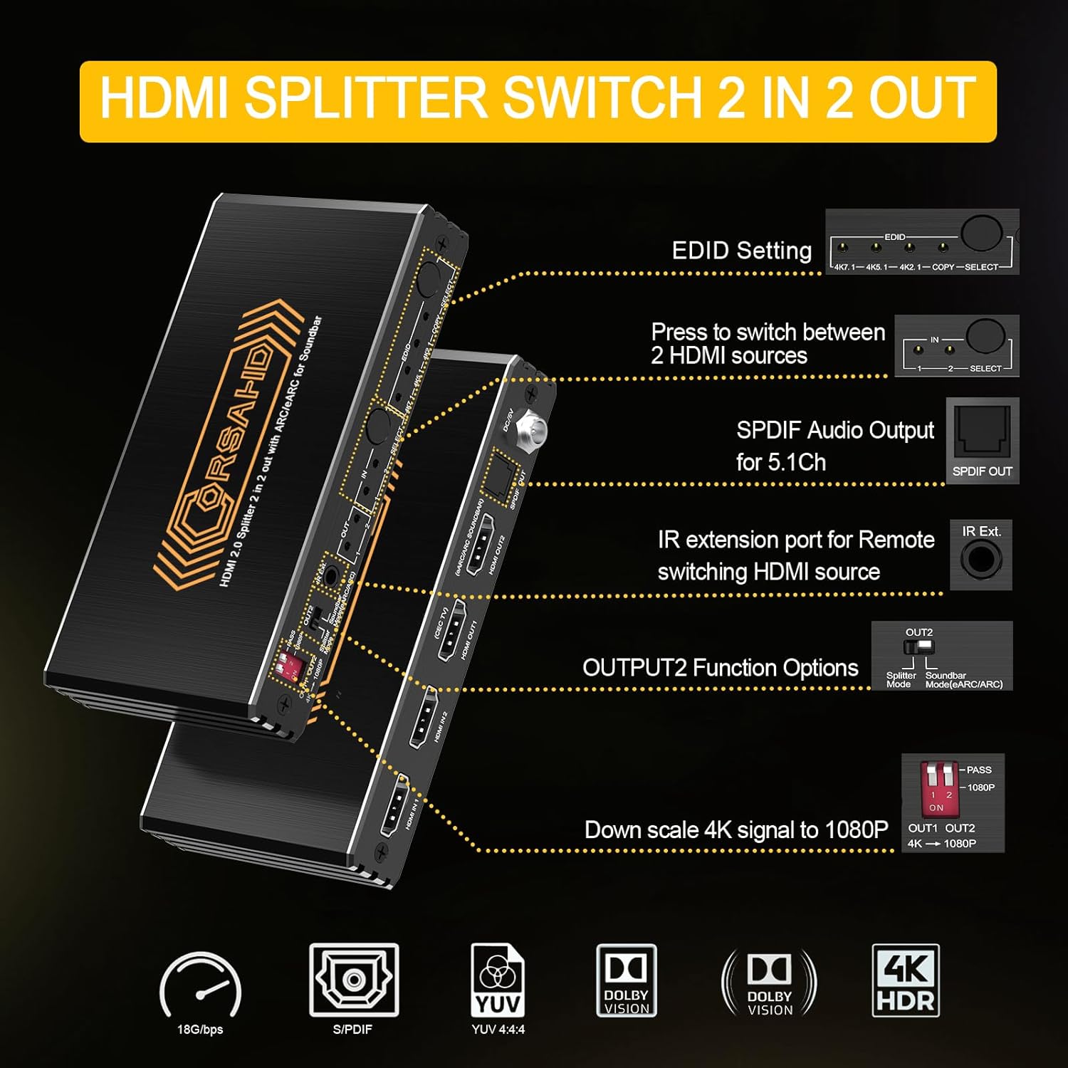 【HDMI 2.1 Splitter Switcher 2×2】 — CORSAHD HDMI 2.0 eARC Splitter with audio extractor can easily duplicate/mirror 1 HDMI source to 2 displays simultaneously. Also supports switch between 2 HDMI sources. Supports HDCP bypass. Comes with EDID management,Down scaler function. Works great with PS5, XBOX series, Nintendo Switch, etc..