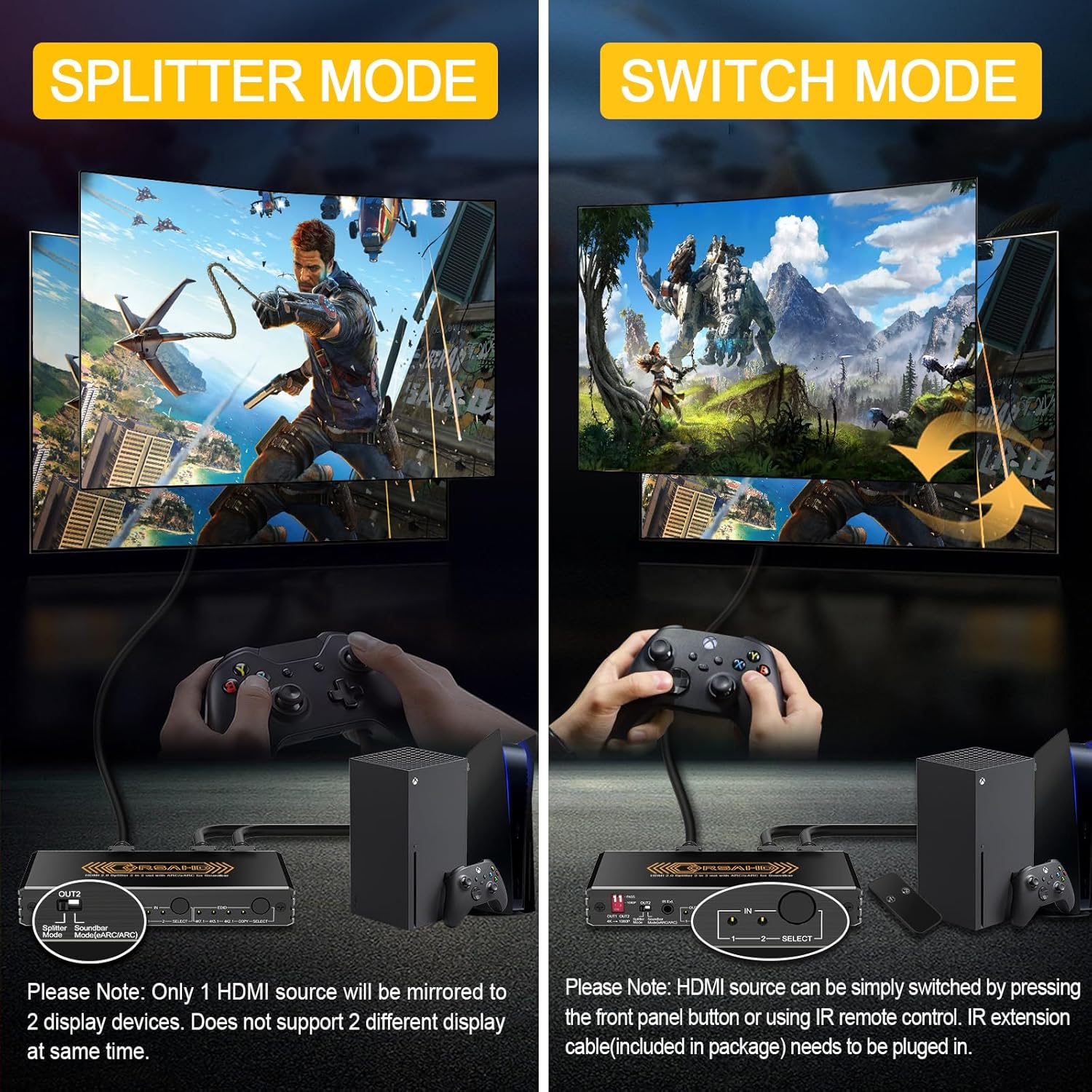 【HDMI 2.1 Splitter Switcher 2×2】 — CORSAHD HDMI 2.0 eARC Splitter can easily duplicate/mirror 1 HDMI source to 2 displays simultaneously. Also supports switch between 2 HDMI sources. Supports HDCP bypass. Comes with EDID management,Down scaler function. Works great with PS5, XBOX series, Nintendo Switch, etc..