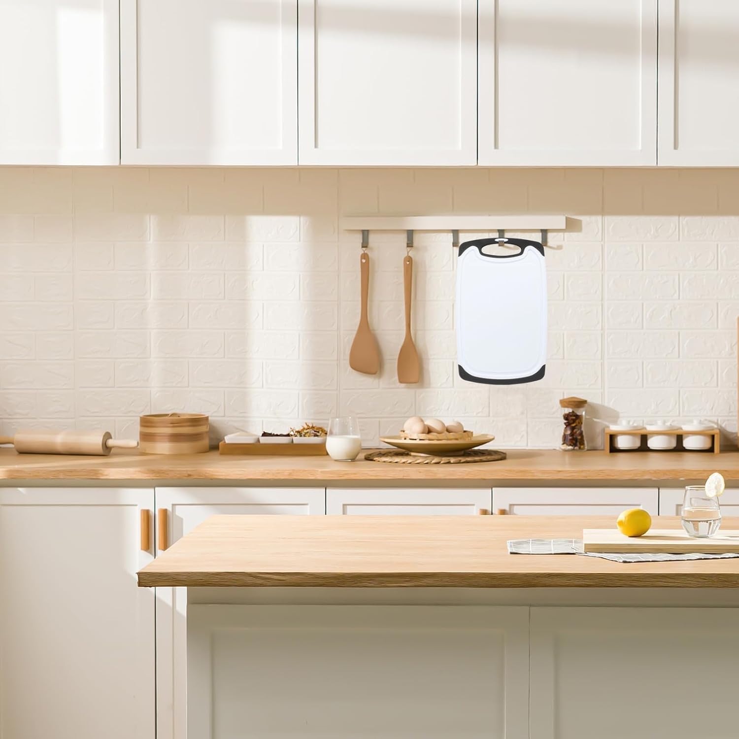 TPE non-slip edges: Both sides of our hard plastic cutting boards are coated with TPE, providing strong adhesion and preventing the cutting board from slipping on most smooth surfaces. Say goodbye to sliding while chopping. Each washable cutting board comes with a hanging loop handle for easy storage.