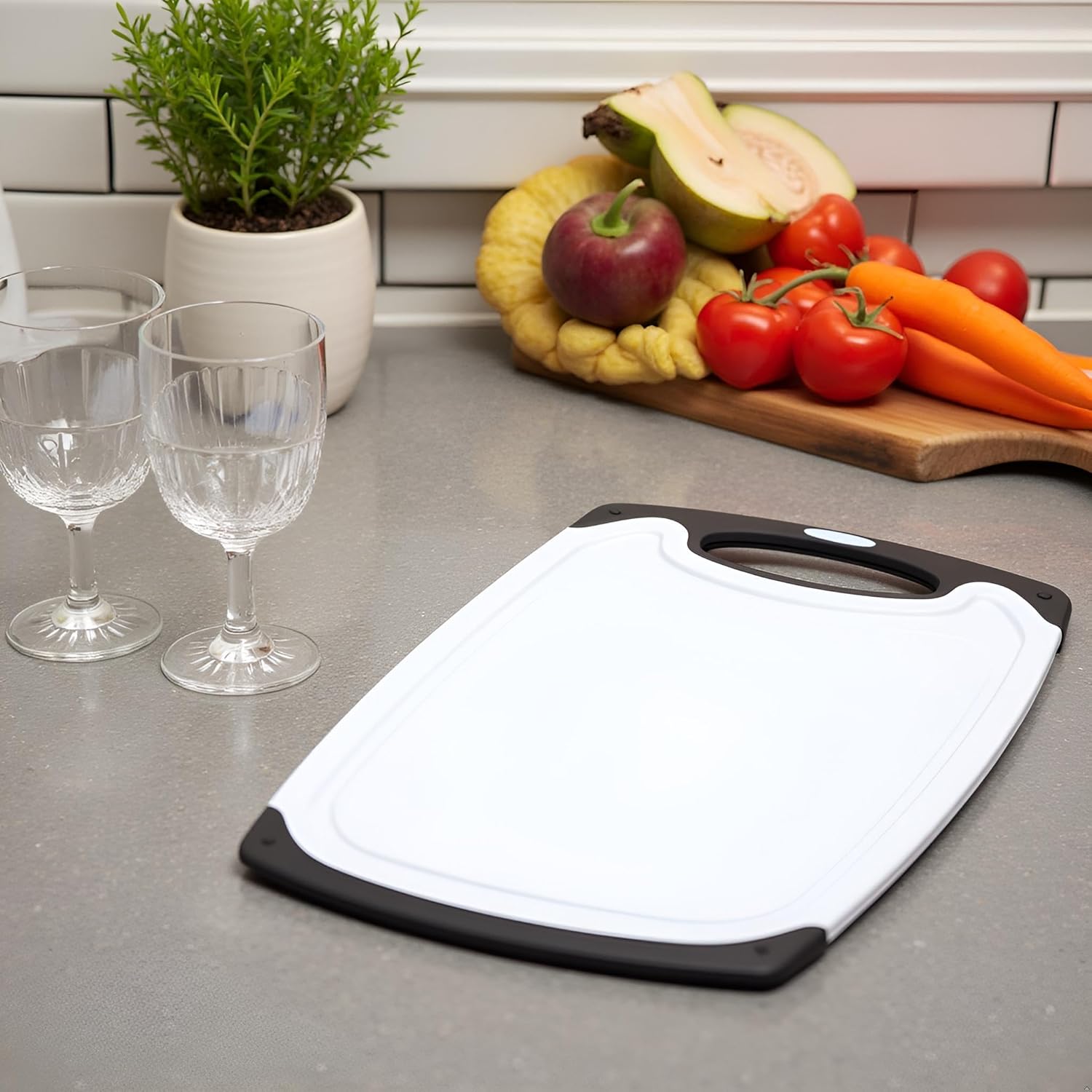 Safe and reliable: These high-quality kitchen cutting boards are made from food-safe, BPA-free hard plastic, ensuring durability and safety. Their scratch-resistant surface is perfect for practical use in the kitchen, whether it’s chopping, slicing, dicing or even presentation of meats, vegetables, cheeses, and fruits. Protect your countertops from prolonged cutting and scratching.