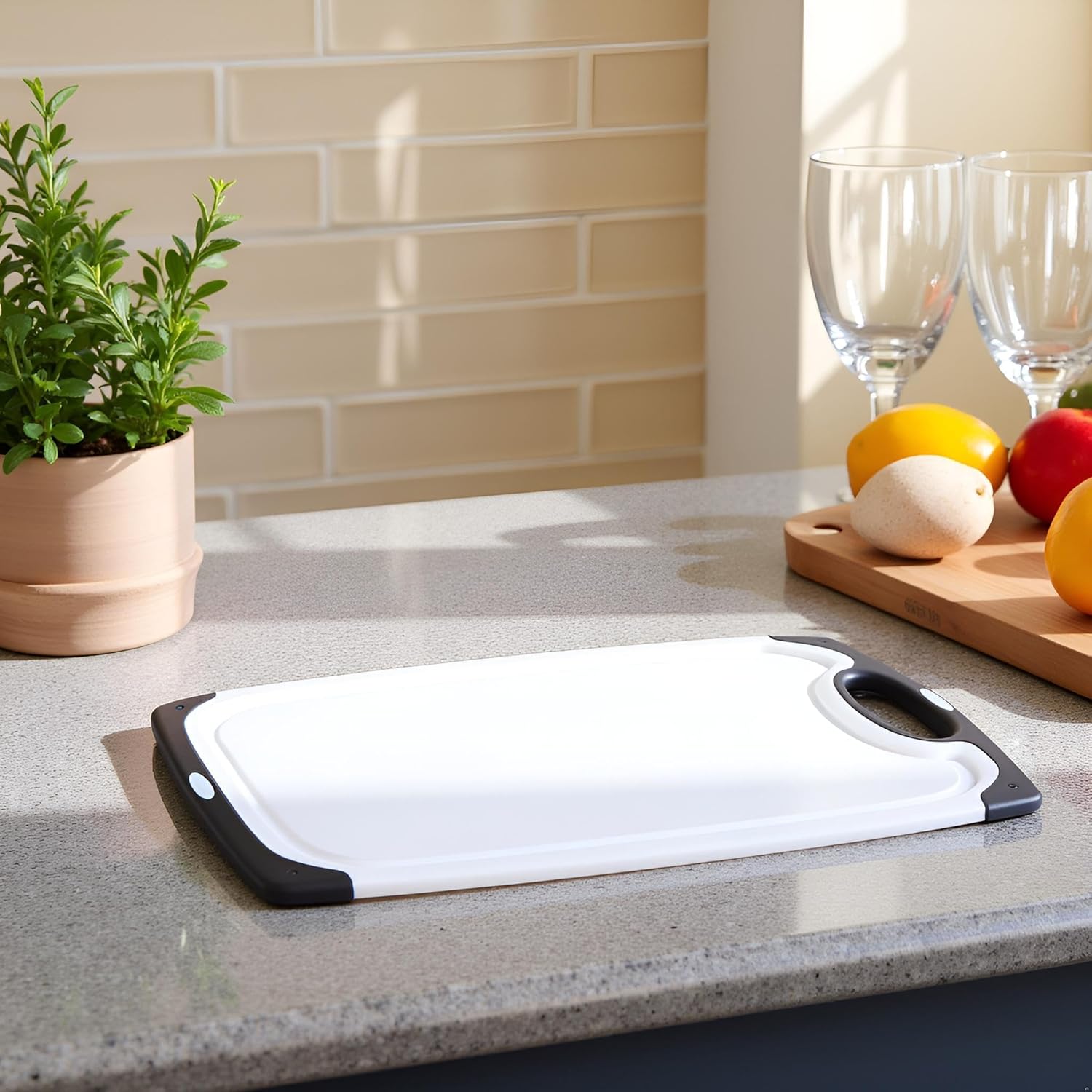 Built-in groove: Our plastic cutting boards are designed with grooves on all sides to prevent liquid from flowing onto the countertop, keeping your kitchen clean and tidy. The TPR edge handles are firm and convenient for food preparation and storage.