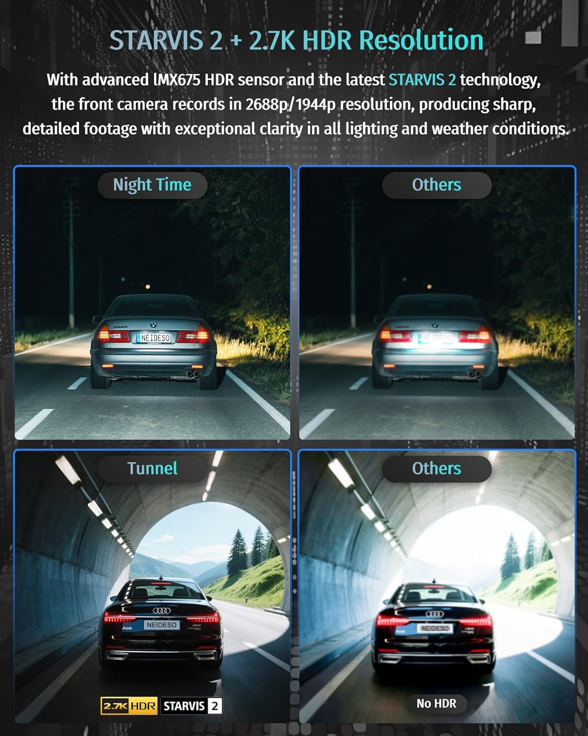 【STARVIS 2 Super Night Vision】360°car camera equipped front camera IMX675 HDR sensor, preventing overexposure in environments like exit tunnel in day, headlights in night. Left right and rear cameras’ 12 LED infrareds offer clear recording inside car in night. F/1.6 aperture’s light-gathering capacity is 26.5% higher than f/1.8. Wide dynamic range auto-adjust the balance in low light or exposure for clear recording. Color isn’t distorted, clearly display license plates and pedestrians