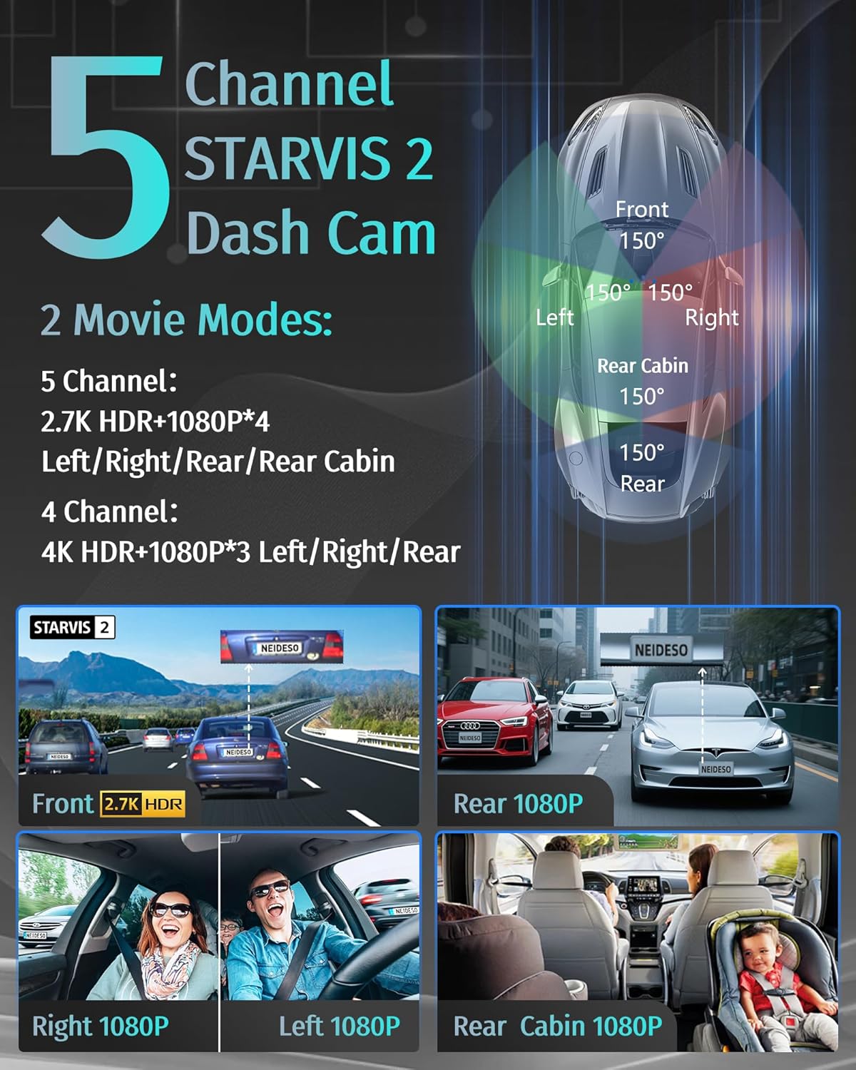 【5 Channel 360° All Sides Dash Cam】Neideso N900Ultra 5 Channel dash cam front and rear inside providing 360° view. Its ultra-wide-angle lens have 150°*5 field of view, 5 car cameras can be rotated and adjusted angles, ensuring 360° full protection. Dash cam simultaneously monitors the front, cab, rear cabin, sides and rear of the vehicle. Keep clearest and comprehensive evidence like collision in congested traffic conditions suitable for Uber/Lyft driver, commuter, business vehicle and familiy.