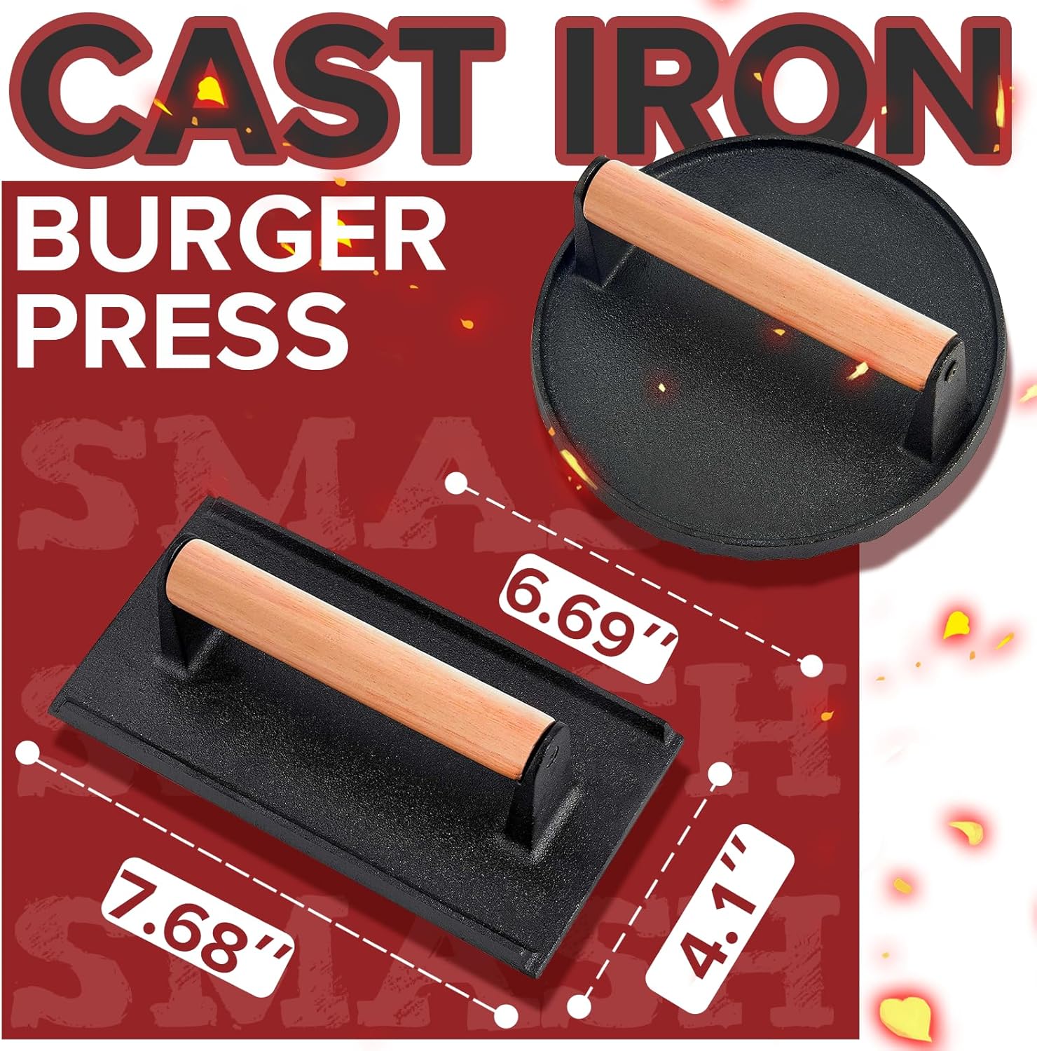 ESSENTIAL 5PCS BURGER SMASHER SET 5pcs smash burger press set : 1 * 6.69″ Round Cast Iron Hamburger Press , 1 * 7.68” X 4.1” Rectangle Smasher Tool , 1 * Hamburger Press Patty Maker , 100pcs 5.9” X 5.9” Parchment Paper Squares , 1 * Packaging .