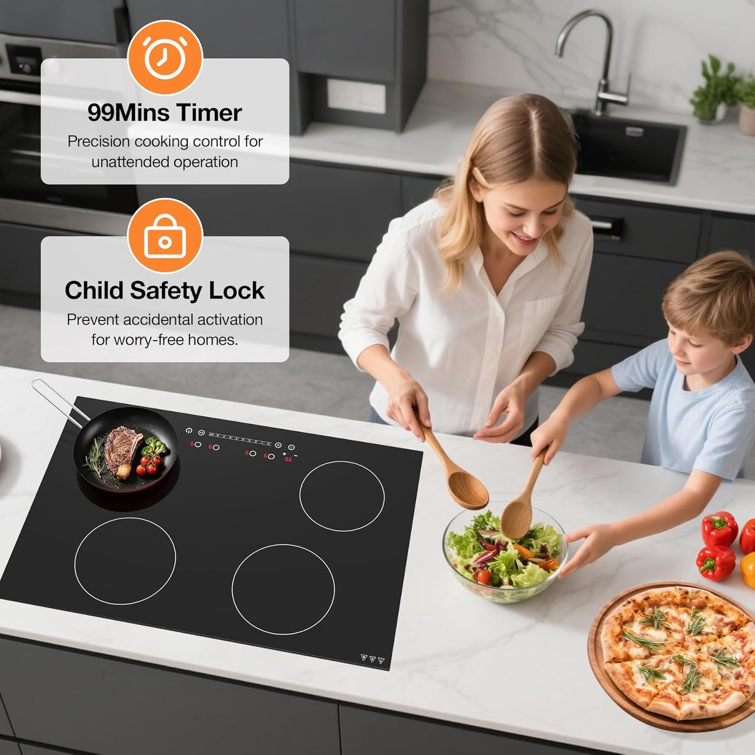 99 Min Timer & Child Lock: The program can precisely control cooking time for up to 99 minutes with auto shut-off. Engage instant child lock to disable cooktop controls, while dual auto shut-off activates when pans are removed or timer completes