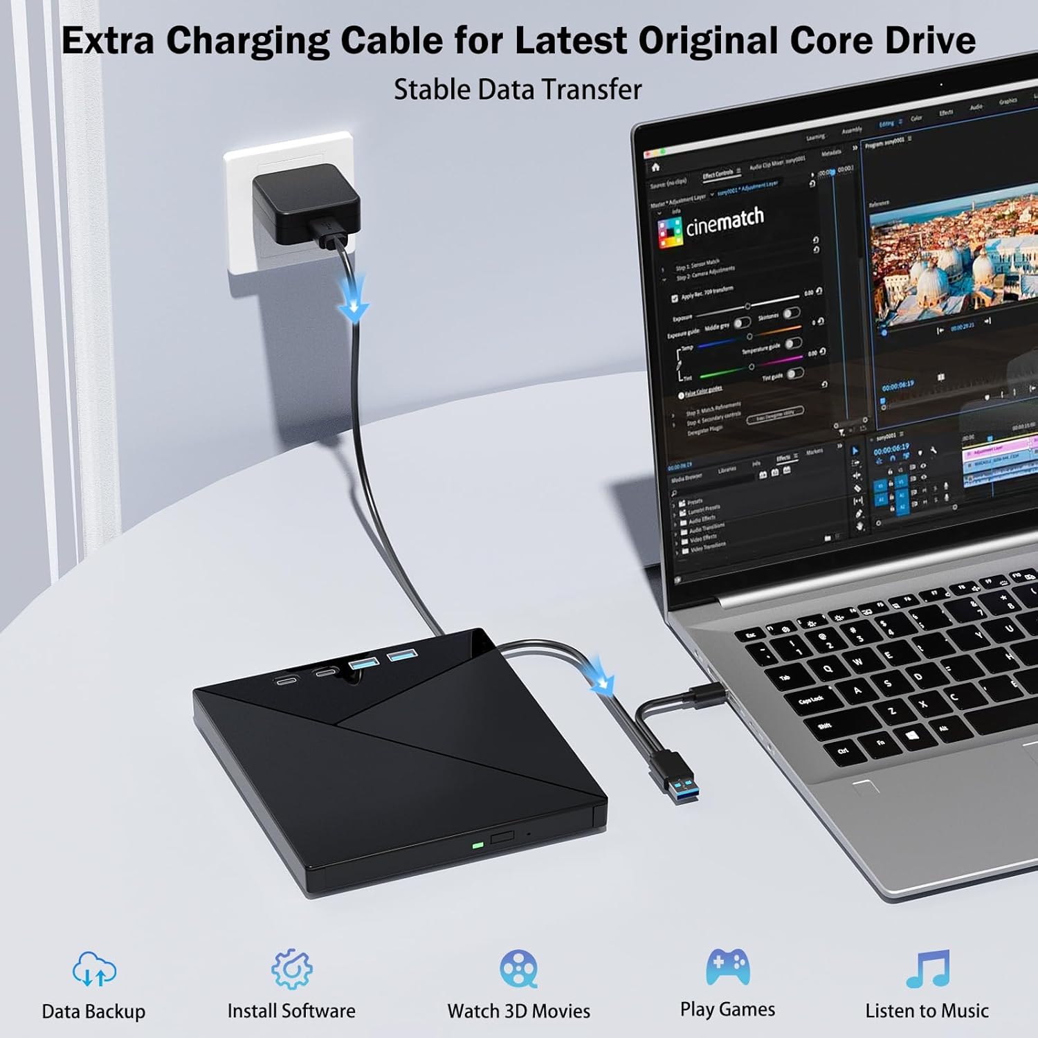 Portable Blu Ray Player: The unique design of our Bluray drive combines both the drive and two different USB cables in one, making it highly convenient and practical. Moreover, the drive features two concealed wire grooves that are specifically designed to store and carry both USB3.0 and Type-C interfaces. This feature helps users to easily store and transport the Bluray drive without taking up too much space or risk losing one or both cables. The design is both stylish and functional, easy connectivity and setup. With its innovative design and practical features, our Bluray drive is an great choice for users seeking a reliable and versatile external optical drive.