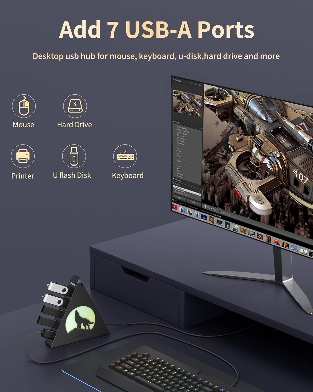 【RGB Lighting with Unique Triangular Design】Note: Please push the button once to turn on/off the night light on the side.Bring energy to your workspace with this stylish rgb usb hub, featuring a vivid wolf-head pattern that cycles through 7 colors. Its triangular, modern form fits perfectly into any desktop usb hub layout while also doubling as a visual centerpiece. The vertical design helps conserve desk space—making it a standout usb hub tower for users who want flair with function. It also includes double-sided adhesive so you can mount it wherever works best.
